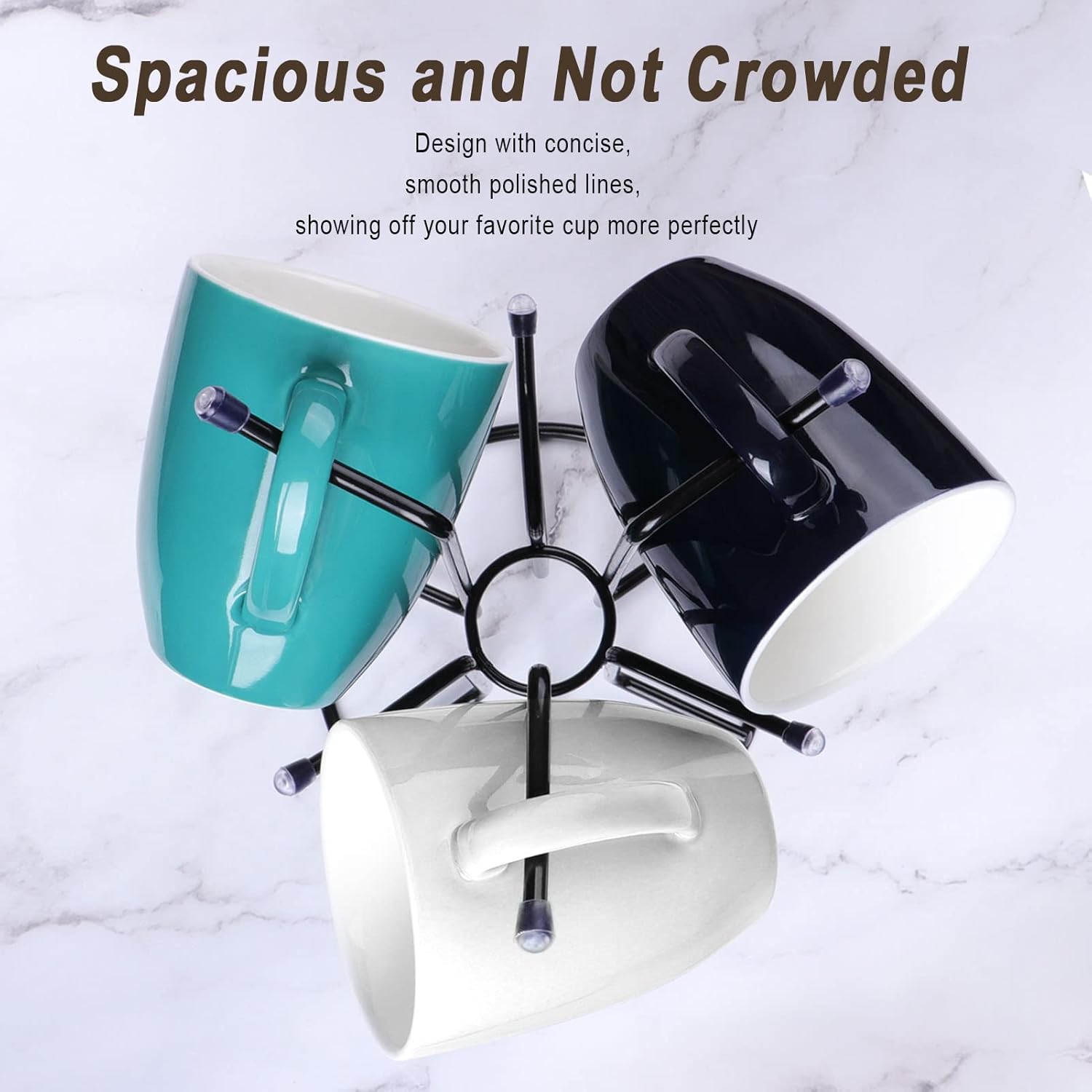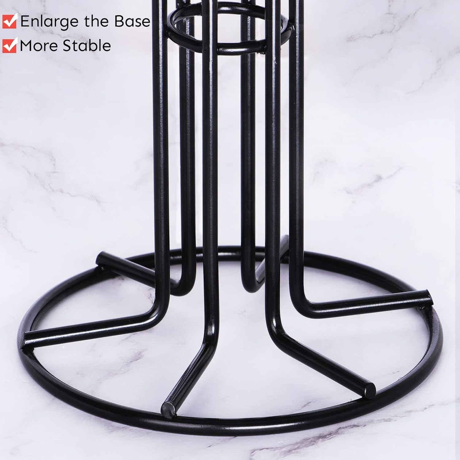 - Sturdy and Stable: HULISEN Mug holder bottom diameter is increased to 6.5 inches, even if you put more cups on one side, it will not affect the balance. Sturdy bottom ensures the coffee mug tree stand stably on the counter. Hook adopts an upwards arc design to prevent the cup from falling, each center rod keeps the cup from sliding inward.