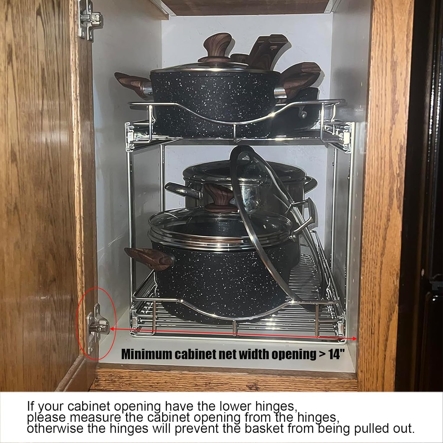 - ※ Excellent Design: The upper and lower wire baskets of this Cabinet Organizer has 2 height adjustment options, and the installation compatibility in the cabinet is better. When installing the lower wire basket, there are two heights to choose from, Which can easily solve the problem that the lower wire basket cannot be pulled out due to the lip of the cabinet.with a minimum height of 13.8 inches and a maximum height of 15 inches.