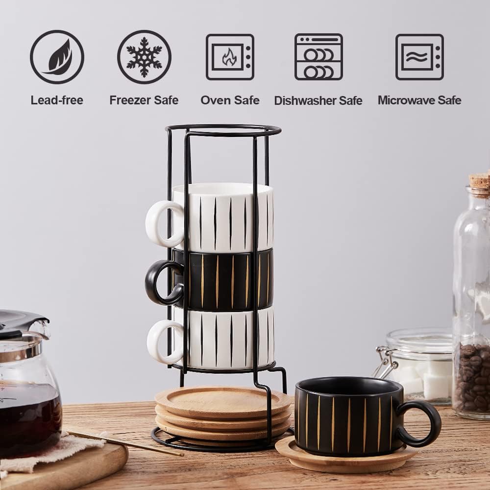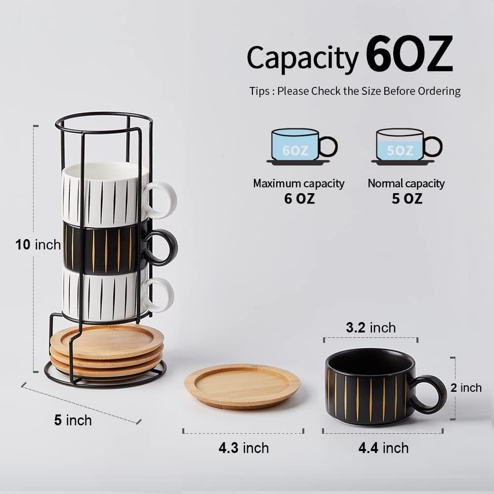 LUKA Porcelain Espresso Cup with Saucer and Metal Stand, 6 Ounce Stackable Ceramic Demitasse Espresso Mugs Cappuccino Cups Set for Latte,Coffee,Cafe Mocha,Tea(Set of 4)