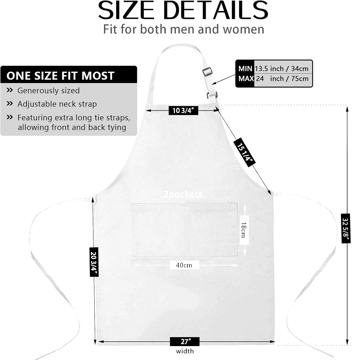- One Size Fit Most - Suitable for both men and women, and adjustable neck strap and long ties that can be easily altered to fit most sizes. You can tie in the front, or back, or you can wear it as waist apron.