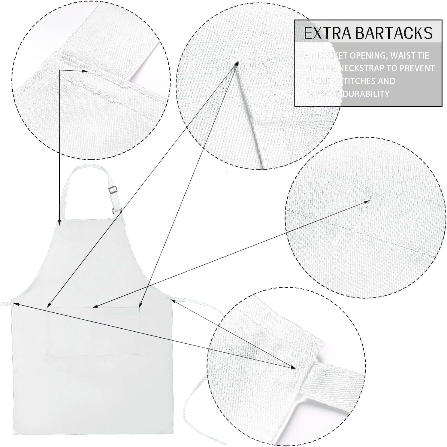 - Built To Last - We use great cotton blend quality that the cheap aprons can't match! Heavy Duty, yet soft & comfortable. And we specially add bartacks at neck strap, waist tie strap and all pocket opening, to avoid broken stitch and reinforce durability.