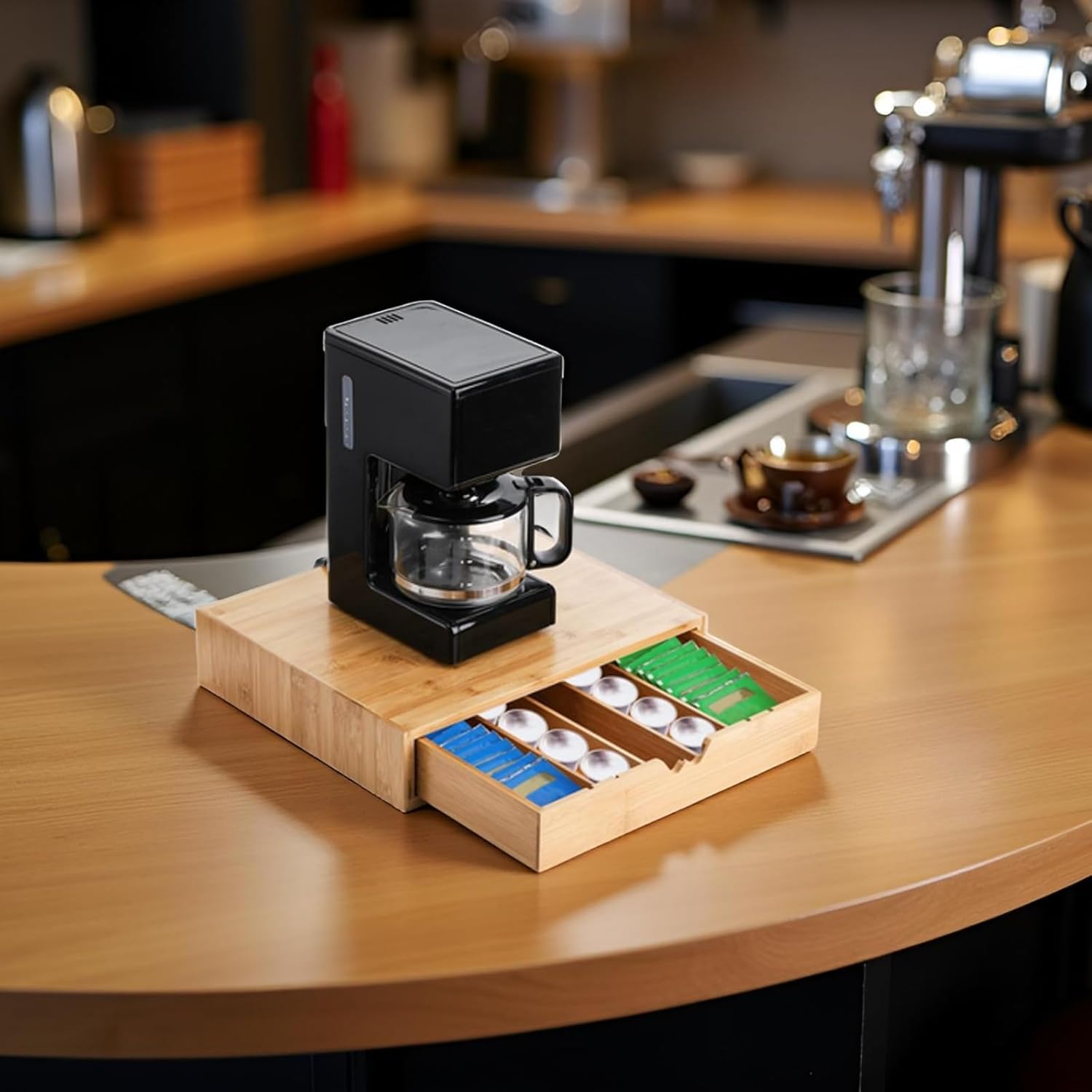 - The bamboo coffee cup drawer is equipped with 4 partitions and 7 card slots. The internal space can be changed according to your needs, which helps you to easily organize coffee pods according to taste or other methods