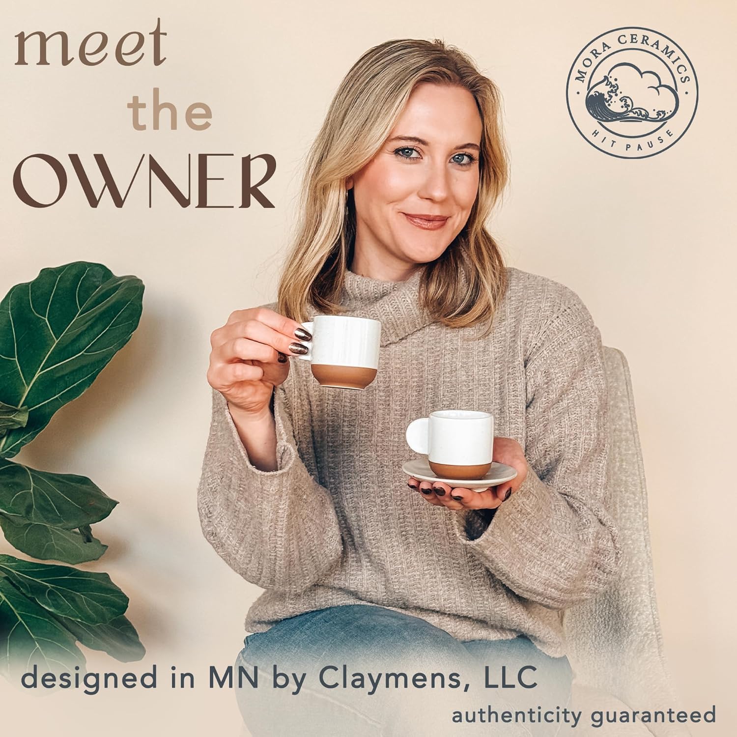 Mora Ceramic Mini Espresso Cups Set of 4, 3oz - Tiny Italian Inspired Mugs With Saucers For Small Shots of Coffee - Modern Boho Style For Any Kitchen or Cafe. Microwave Safe Porcelain - Vanilla White
