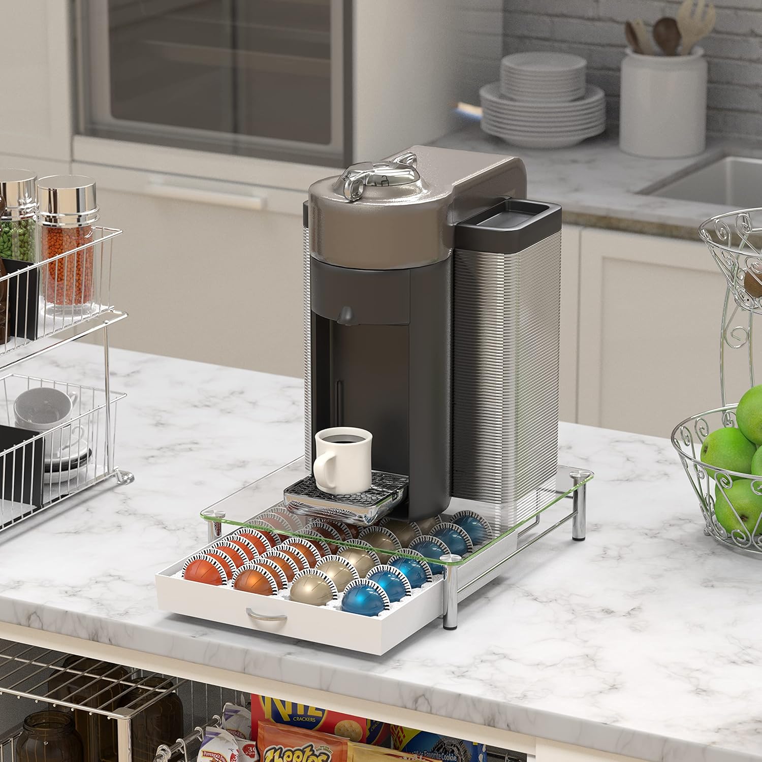 - [ Space-Saving ] Designed to fit under most single-serve coffee makers, it maximizes countertop space by utilizing the area beneath the coffee machine effectively.