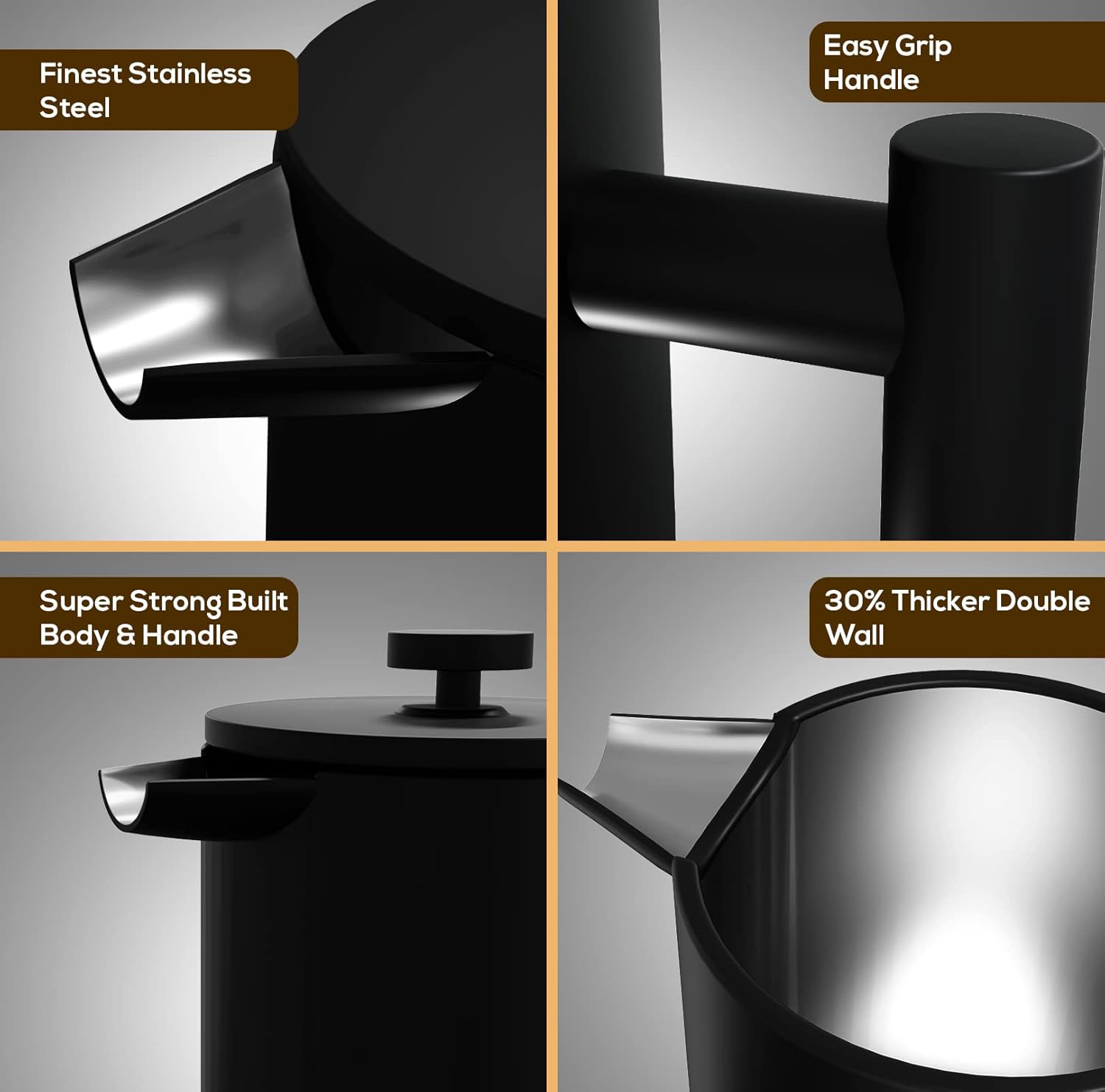 - 4-Layered Filtration System – The high quality filtration system of our steel French press traps the smallest coffee grounds to produce a wholesome cup of coffee, giving you an enriching experience.