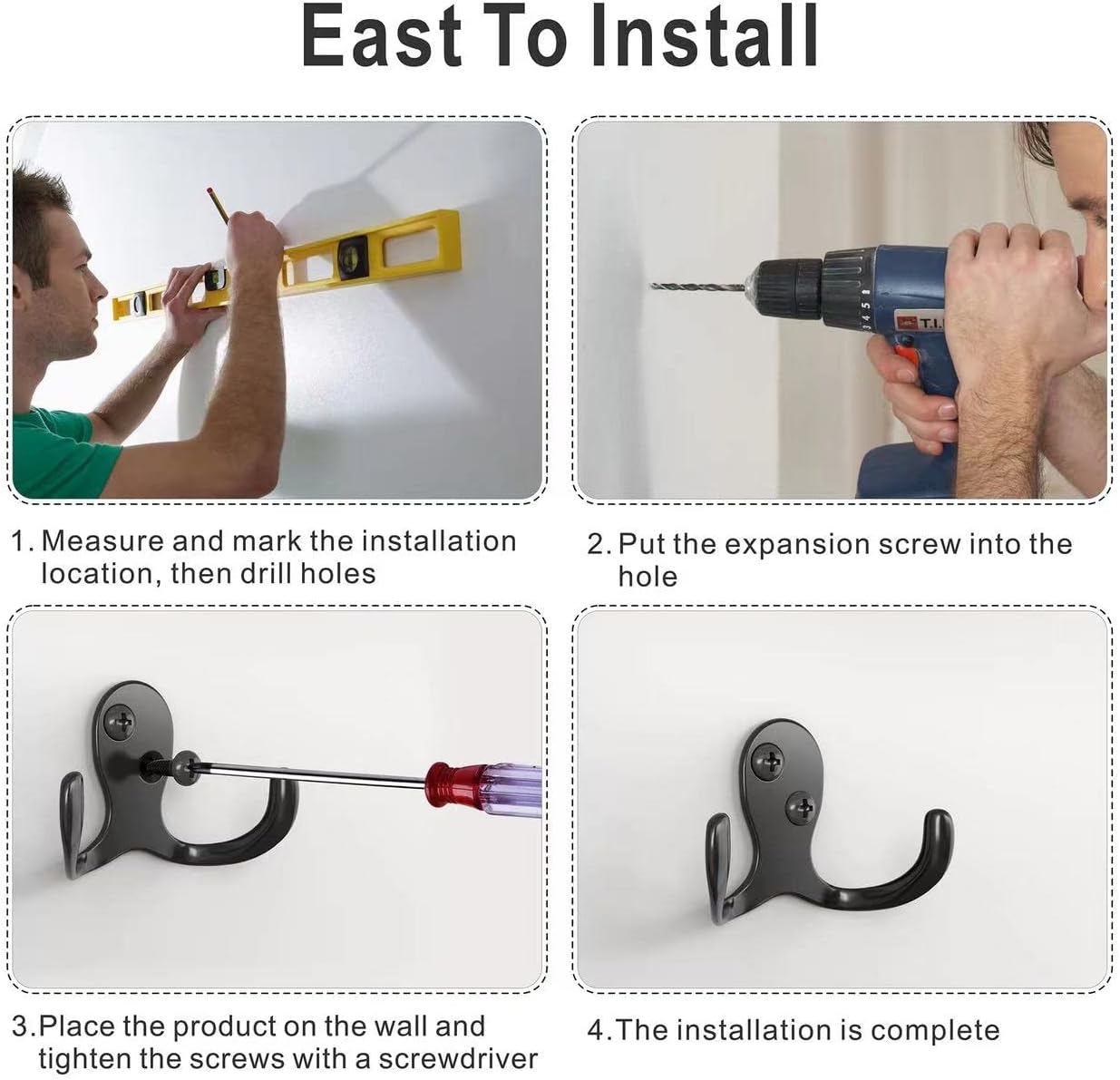 - Material:The Double Coat Hooks not easy to break, anti-rust and anti-corrosion, The Coat hooks are made of zinc alloy and the screws are made of iron, which is hard and durable