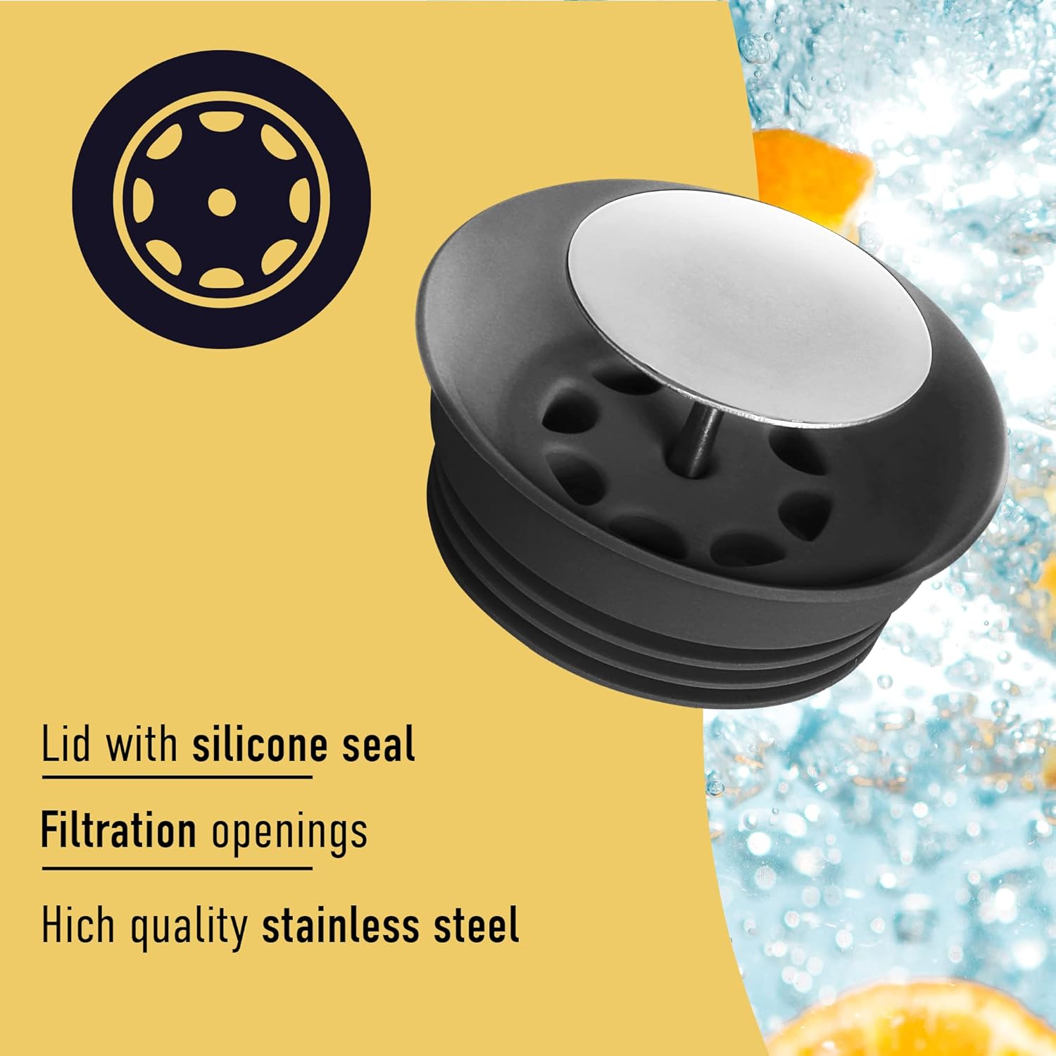- FILTER LID - The food-safe silicone lid with stainless steel top and filter holes will keep ice cubes, fruit, or tea bags inside or conversely allow fruit and ice to pour out more freely; Great for sangria and BPA free