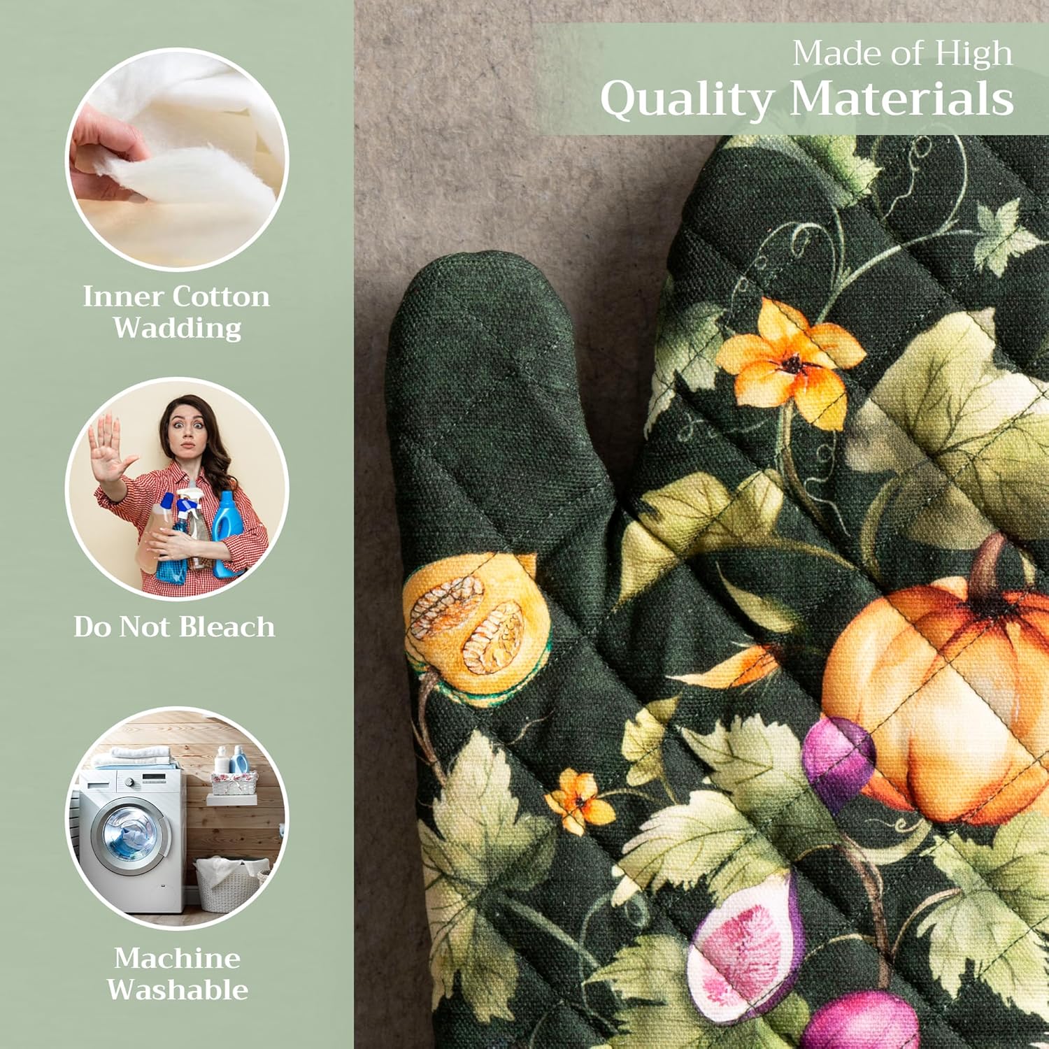 Maison d' Hermine Oven Gloves 100% Cotton Oven Mitt 7" x 13" with Loop Heat Resistant, BBQ, Cooking Gloves, Baking, Grilling, Kitchen, Handling Hot Pans (Pack of 1, Pumpkin Garden - Dark Green)