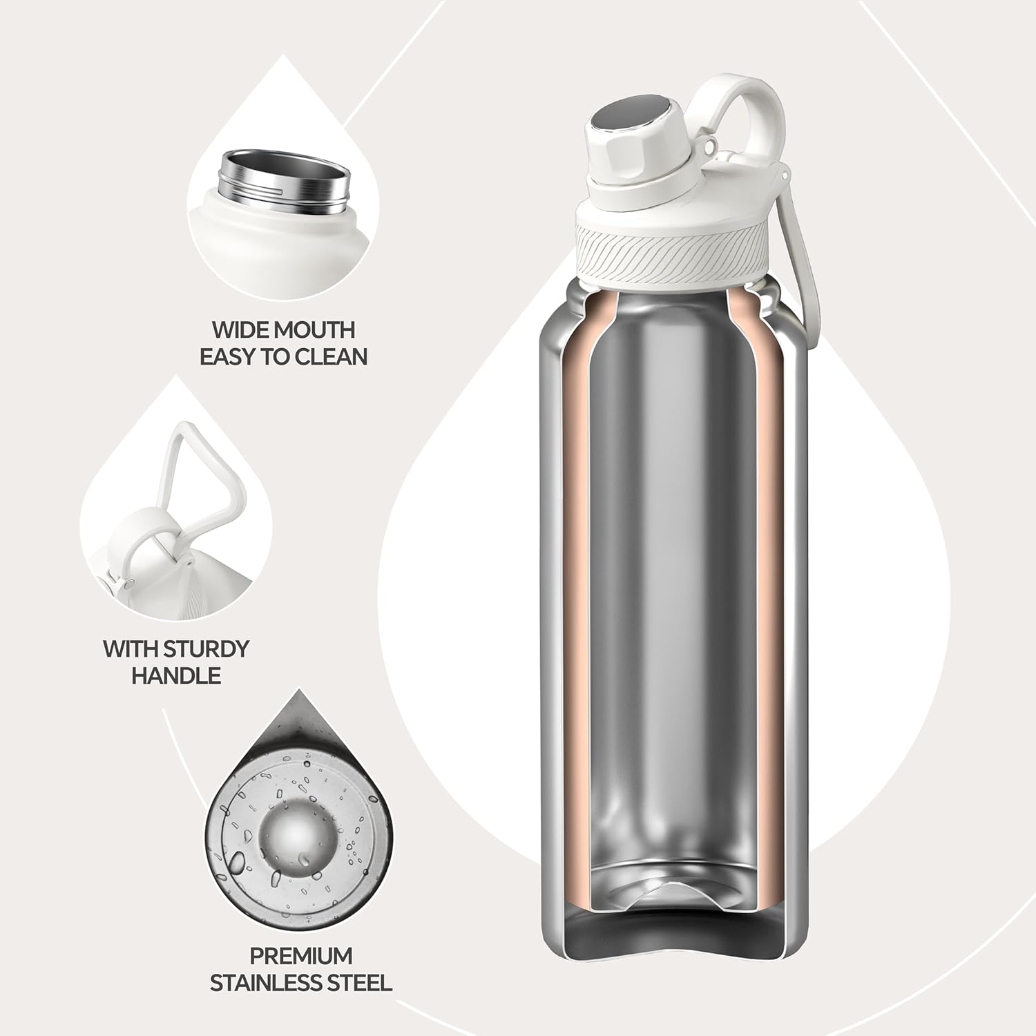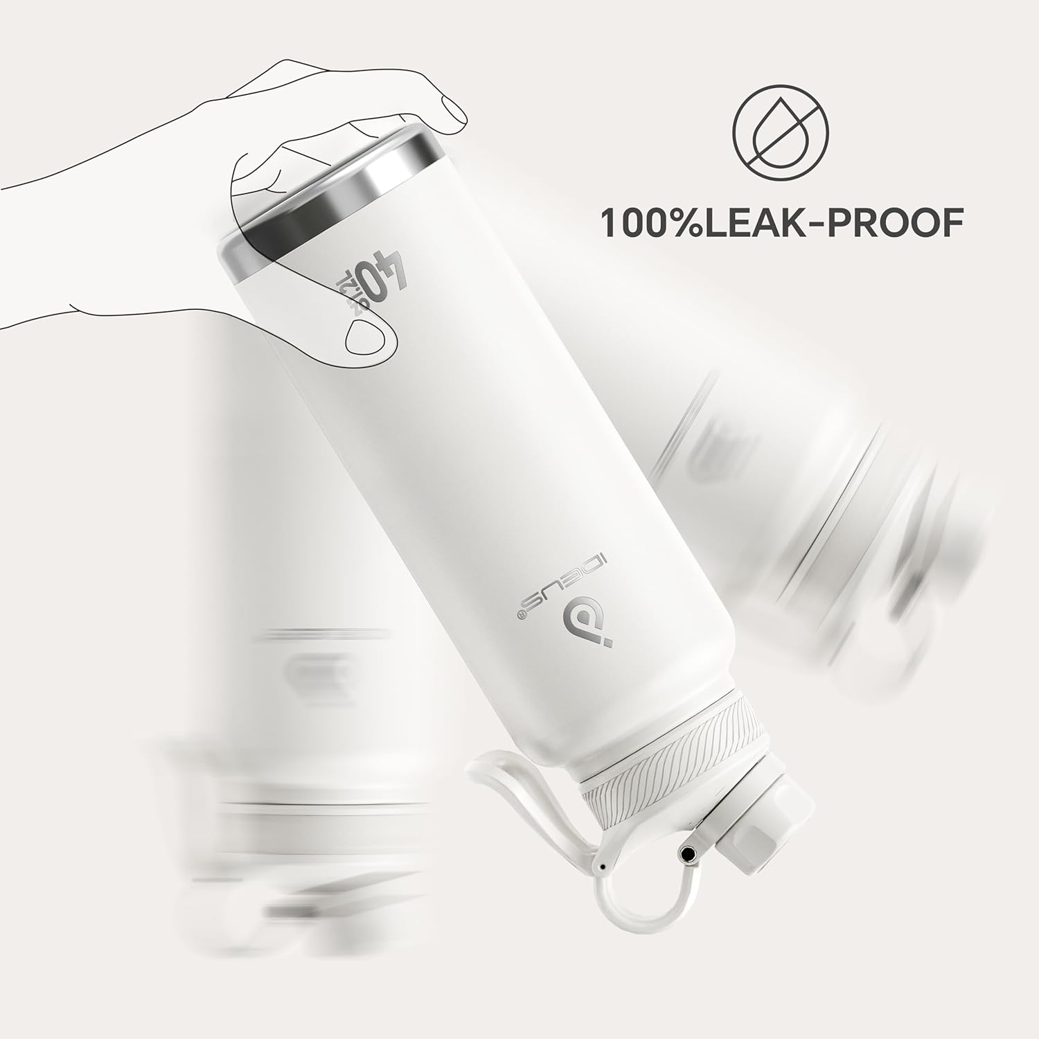 IDEUS Insulated Stainless Steel Water Bottle with 2 Leak-Proof Lids, Thermal Water Flask for Hiking Biking, 40oz, White