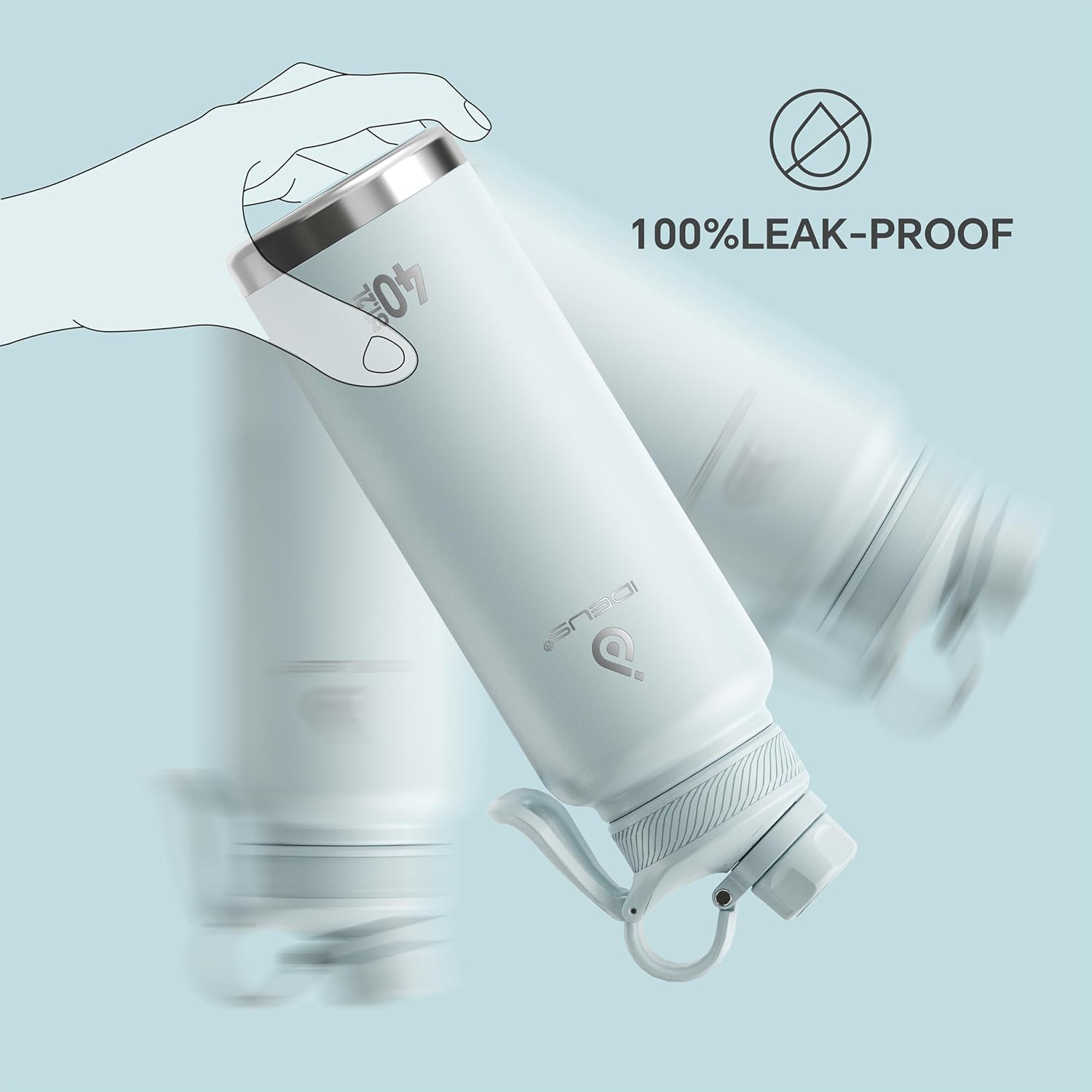 IDEUS Insulated Stainless Steel Water Bottle with 2 Leak-Proof Lids, Thermal Water Flask for Hiking Biking, 40oz, Light Blue