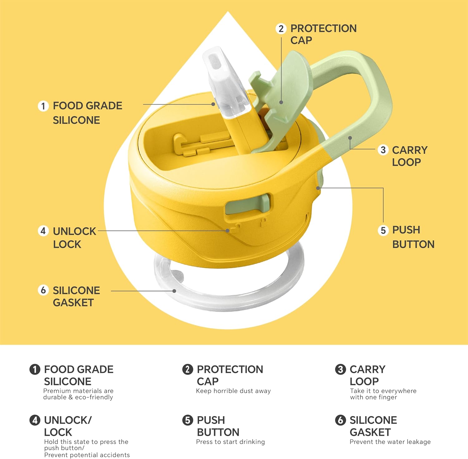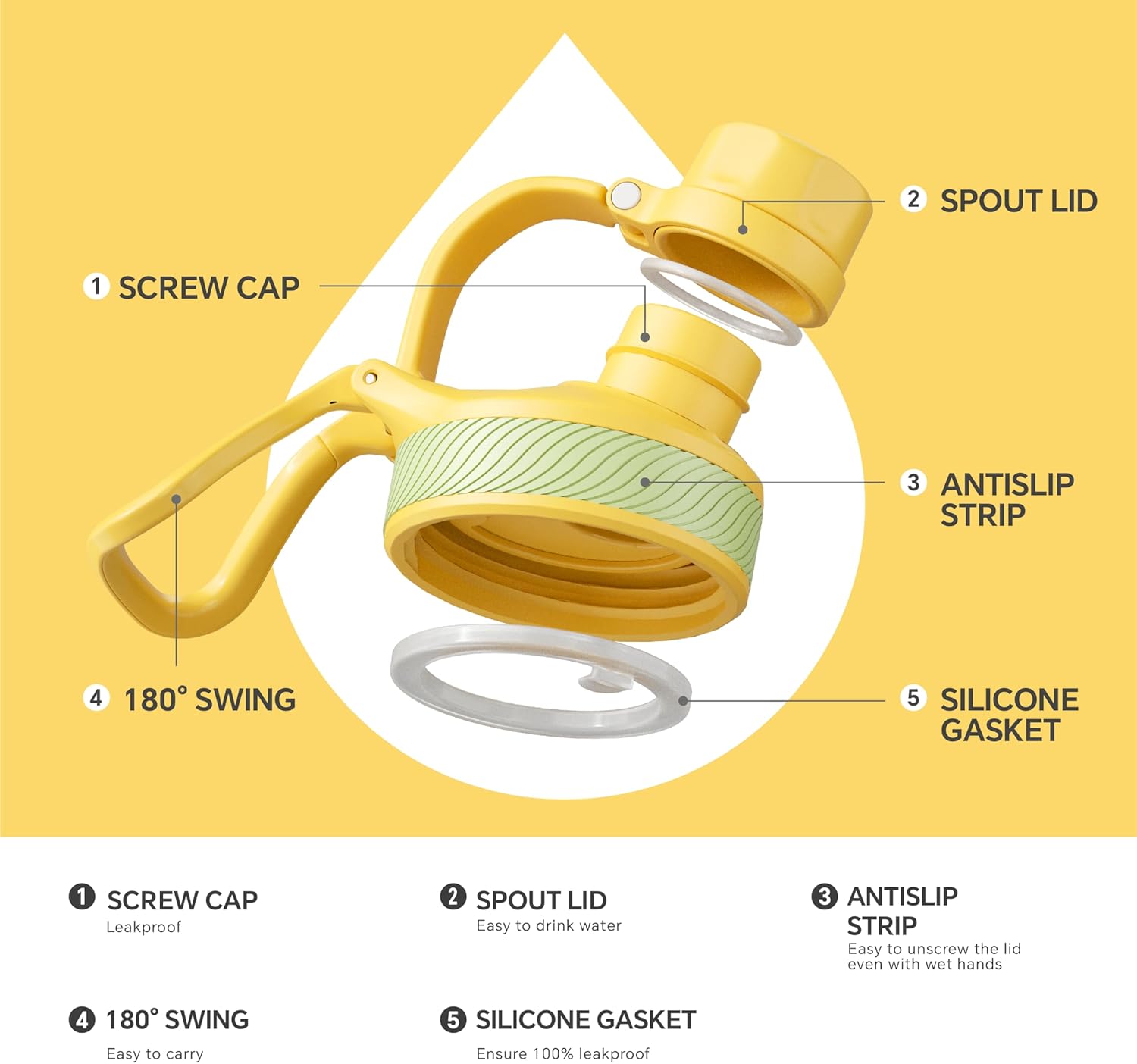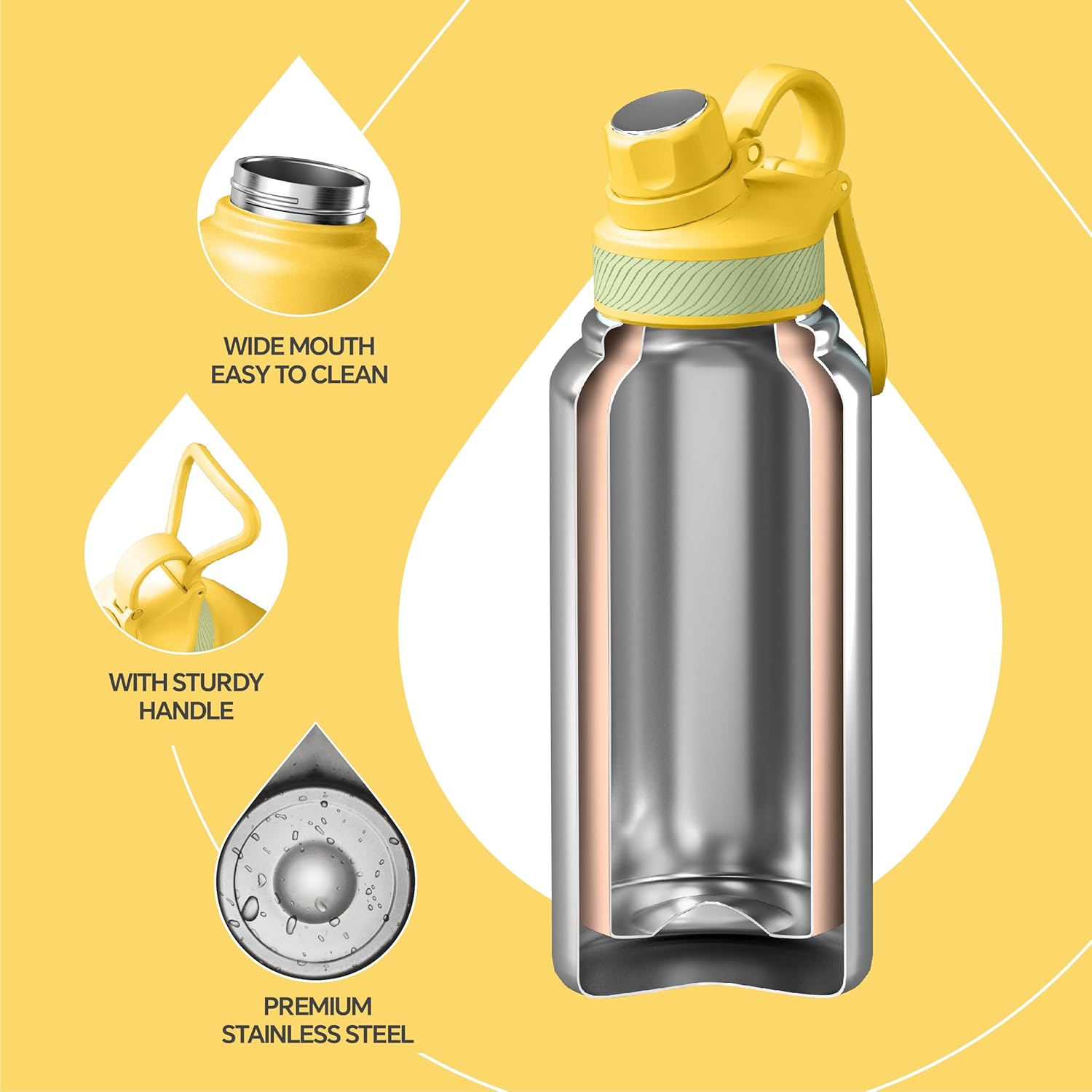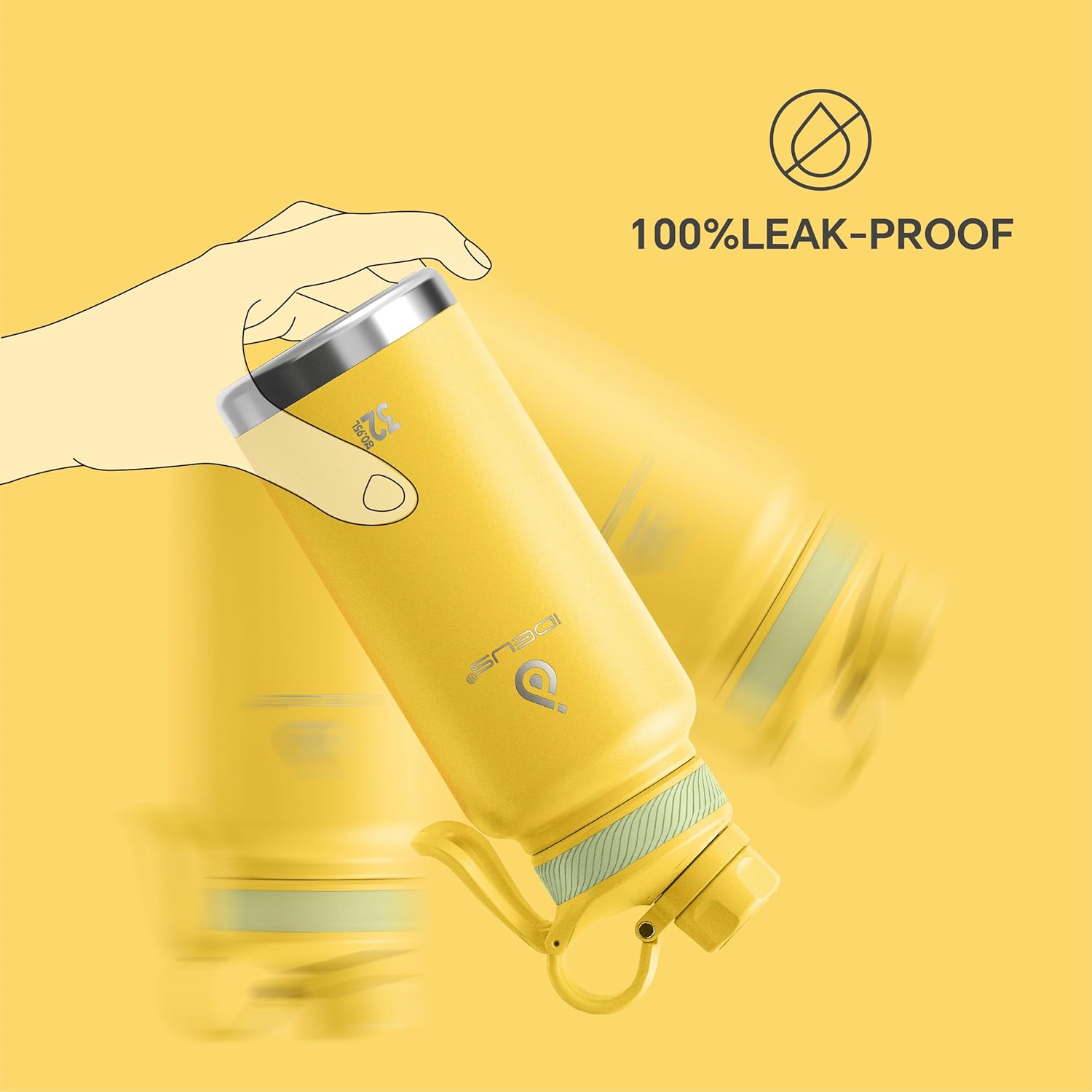 IDEUS Insulated Stainless Steel Water Bottle with 2 Leak-Proof Lids, Thermal Water Flask for Hiking Biking, 32oz, Bright Yellow