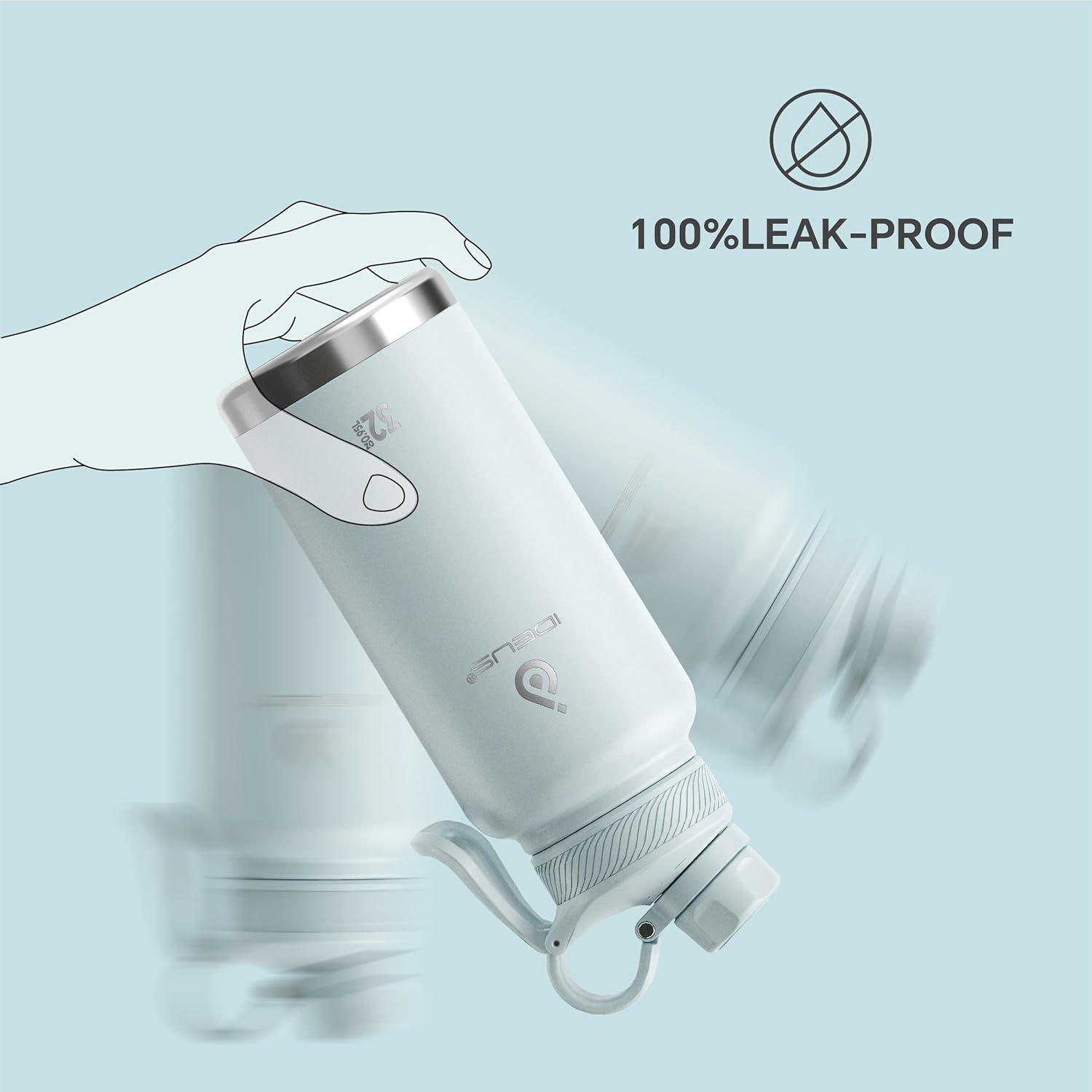 IDEUS Insulated Stainless Steel Water Bottle with 2 Leak-Proof Lids, Thermal Water Flask for Hiking Biking, 32oz, Light Blue