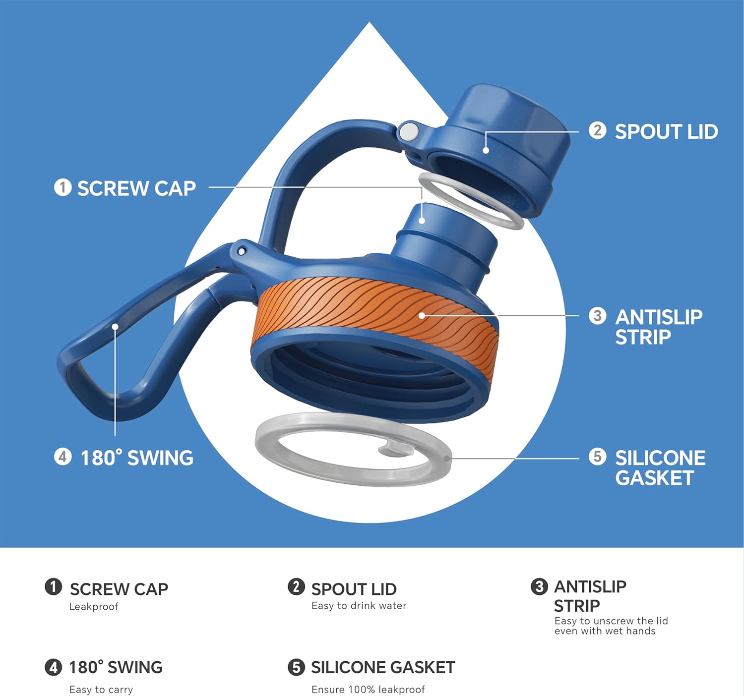 IDEUS Insulated Stainless Steel Water Bottle with 2 Leak-Proof Lids, Thermal Water Flask for Hiking Biking, 40oz, Bright Blue