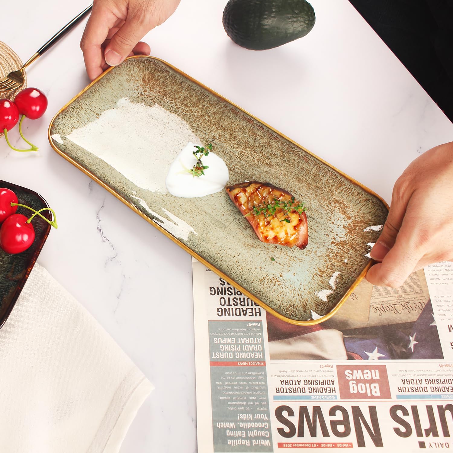 Ceramic Dinner Plates Dish Set, Set of 4, Microwave Oven and Dishwasher Safe,Scratch Resistant, Dinnerware Kitchen Porcelain Serving Dishes Brown glaze change, 12.4 Inch Rectangle plate