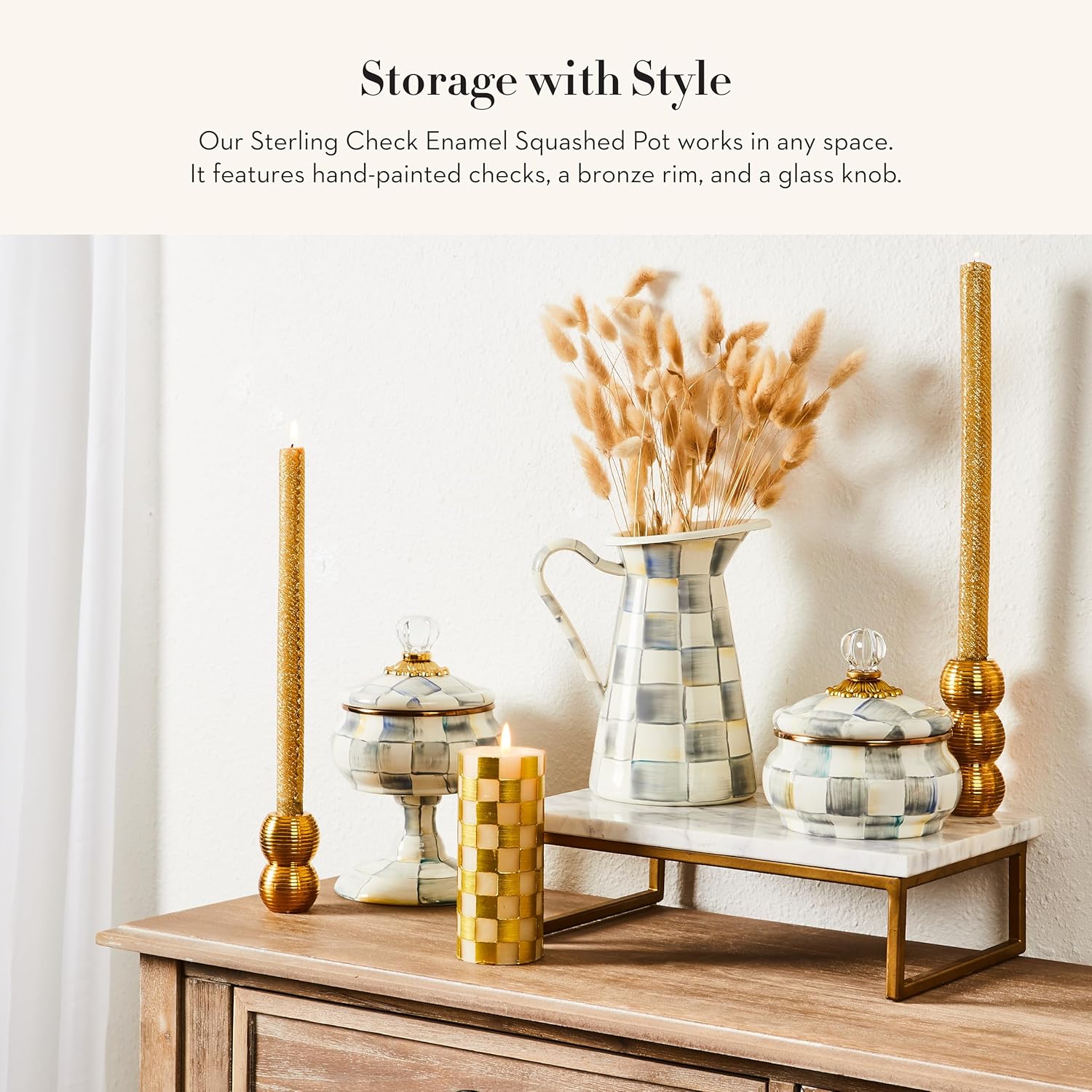 - ELEGANT STORAGE ESSENTIAL: Our Sterling Check Enamel Squashed Pot offers a chubby silhouette and holds 20 oz. It features a heavy-gauge steel underbody decorated with hand-painted gray-and-white checks, a bronzed stainless-steel rim, and a glass knob.