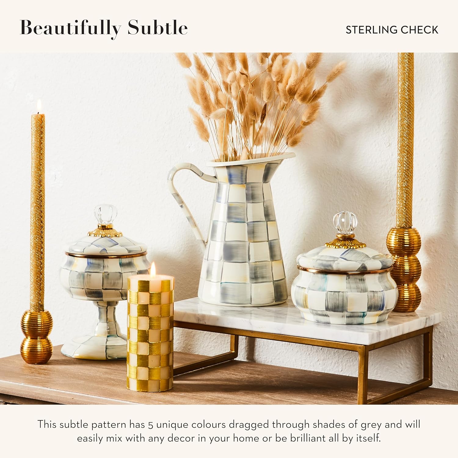 - Material : Heavy-gauge, hand-glazed steel underbody with hand-painted Sterling Checks, rimmed in bronzed stainless steel. Wood handle. Lid is topped with brass accents and a glass knob. Pieces may vary due to the handmade nature of each product. Imported. Heavy-gauge, hand-glazed steel underbody with hand-painted Sterling Checks, rimmed in bronzed stainless steel. Wood handle. Lid is topped with brass accents and a glas… See more