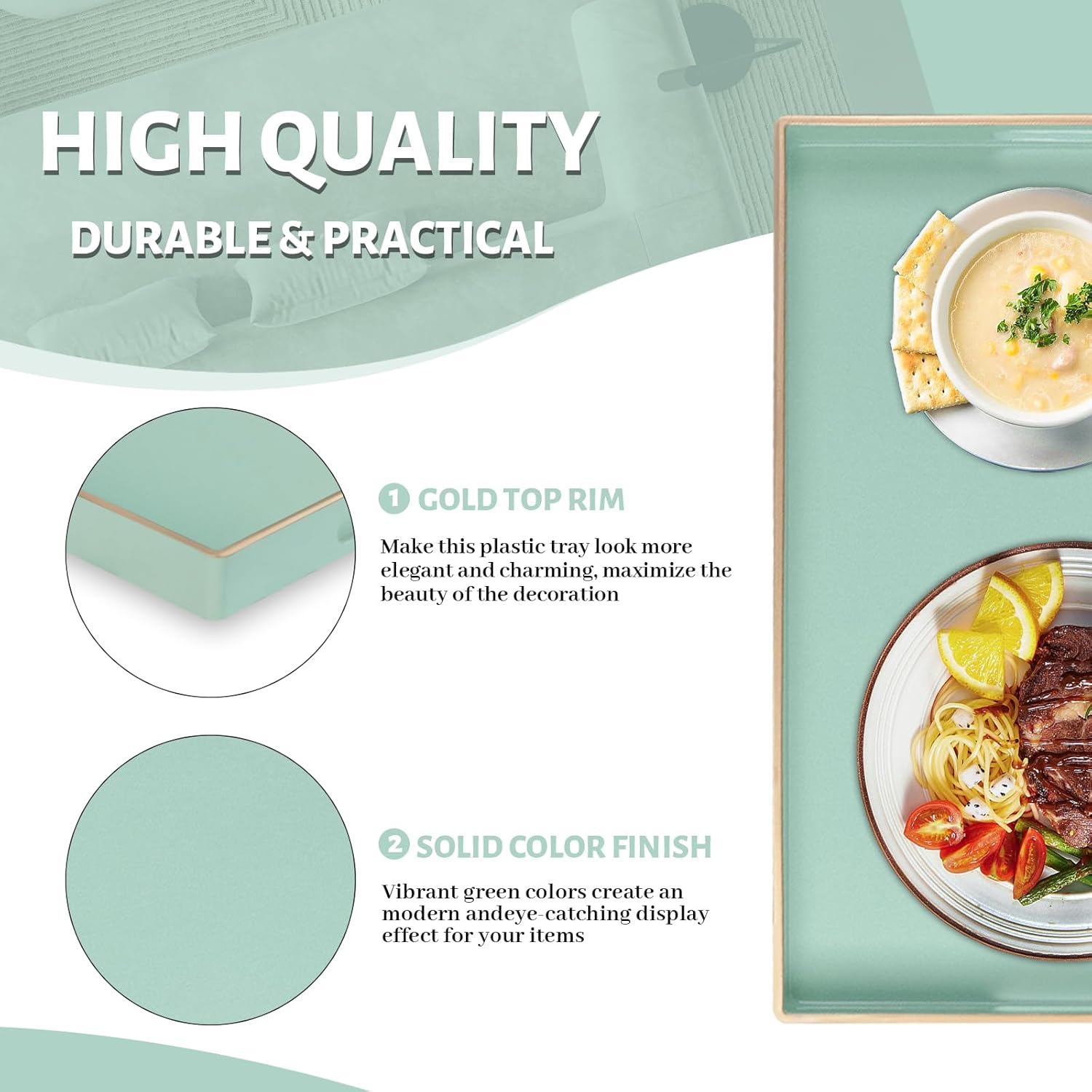 - TRAY DECOR: Mint green tray is often used to present food and drinks in an appealing and organized manner. Rectangle tray can enhance the visual appeal of the items being served, making them more enticing to guests or customers. Also place it on your bathroom vanity as an exquisite showcase for perfumes, jewelry, or bath accessories.