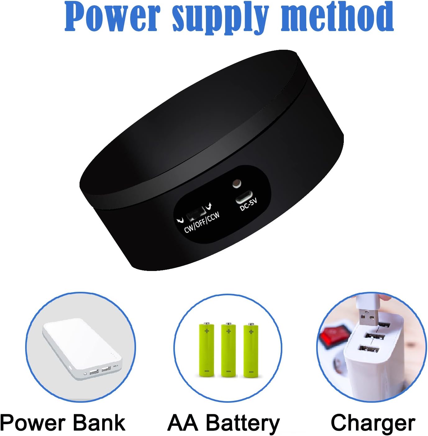 - 【Professional Design】Rotation speed - 17 seconds / circle, Bearing up to 105 oz(Hold up to 3 kg), extremely low noise and low power consumption. Diameter: 16CM, be powered by USB cable, compatible with computer, power bank or any other with USB adapter, also supported by 3xAA batteries(not included) .