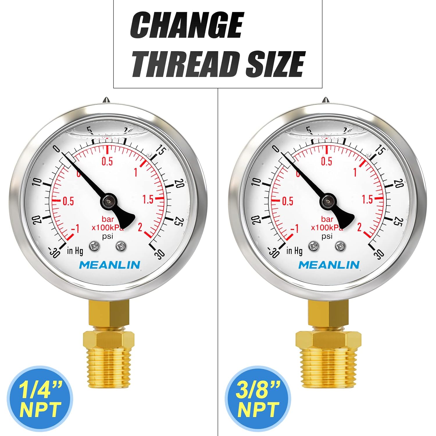 MEANLIN MEASURE -30inHG~30Psi Stainless Steel 1/8" NPT 2.5" FACE DIAL Vacuum Pressure Gauge, Lower Mount, with 1/4" NPT and 3/8" NPT Hex Bushing