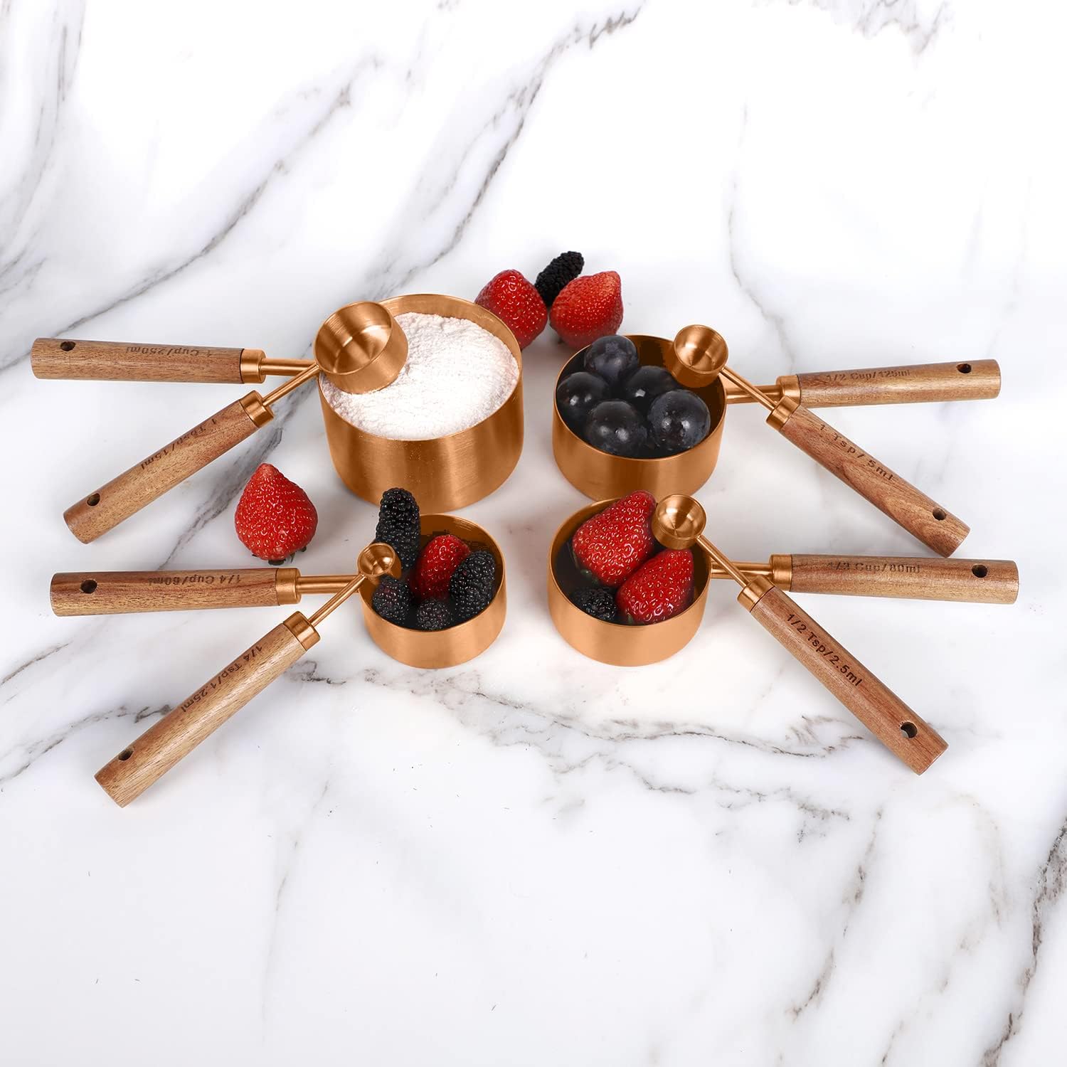 Collection 8 Piece Rose Gold Measuring Cups Set and Measuring Spoons, Golden With fragrant wood Handles-Complete Set of Measure Cups and Spoons For Cooking and Baking.