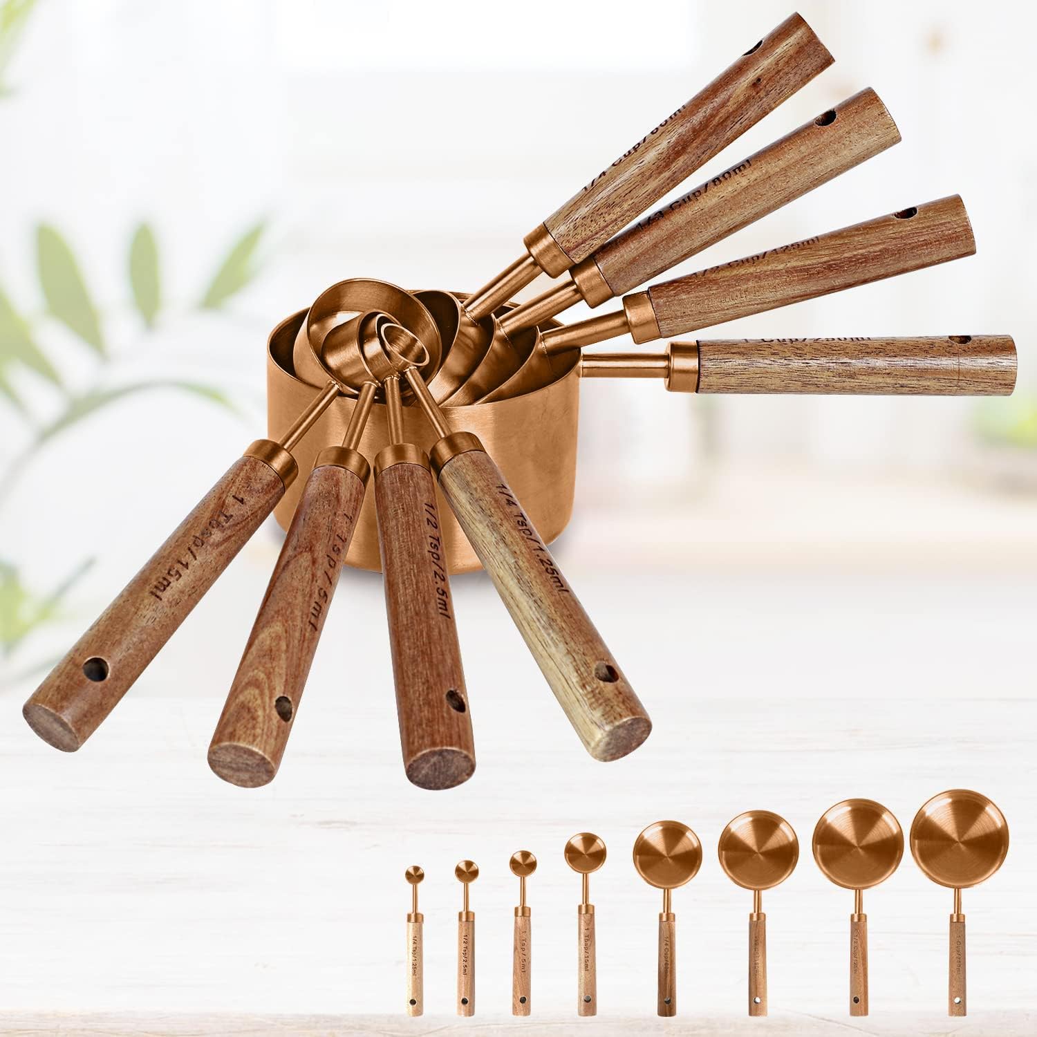 - ✔️【Premium wood scented handle】Our Copper Golden measuring spoons with a high quality wooden handle, sturdy, non-slip wood handle carefully ground to ensure no small wood thorn. With a natural wood aroma, it makes you feel like you are in nature.