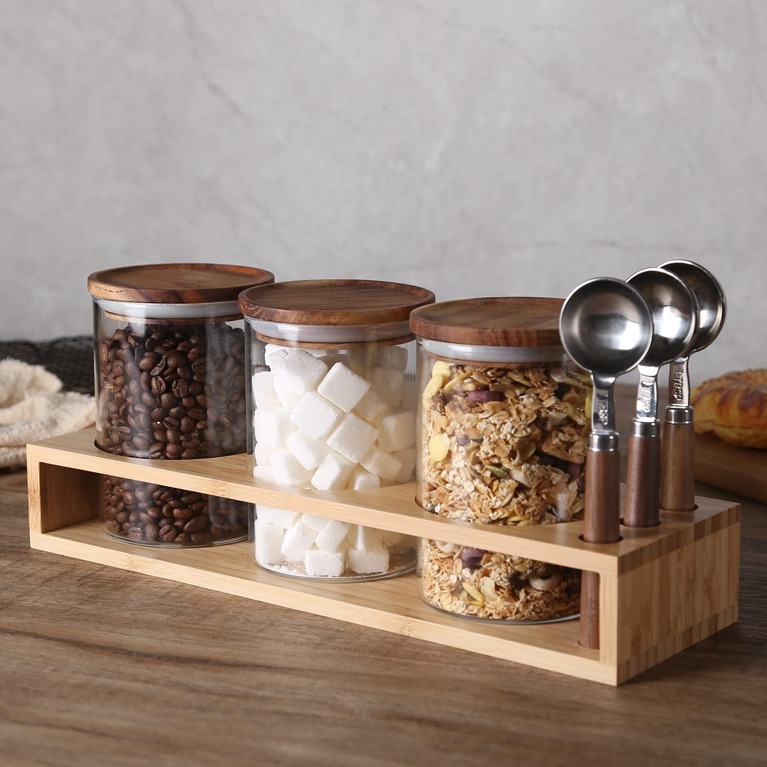 - Complete Set Includes:3 glass sealed jars (Height 5.5'' x Diameter 3.74'',Capacity:25fl oz/750ml),3 wooden handle scoops(1 TBSP) and 1 bamboo rack(14。7'' x 4.6'' x 2.4'' ,L x W x H),Label Stickers.