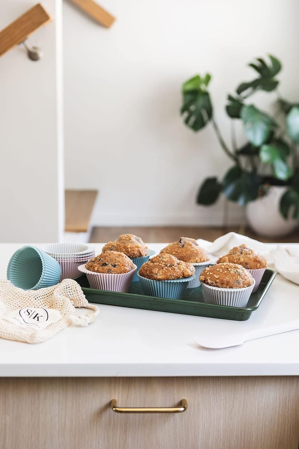 - INCLUDES 12 jumbo food-grade reusable silicone baking cups in 3 beautiful colors, 4 Dusty Rose, 4 Dusty Blue, 4 Pearl Gray, in a gift-worthy cotton mesh reusable produce bag