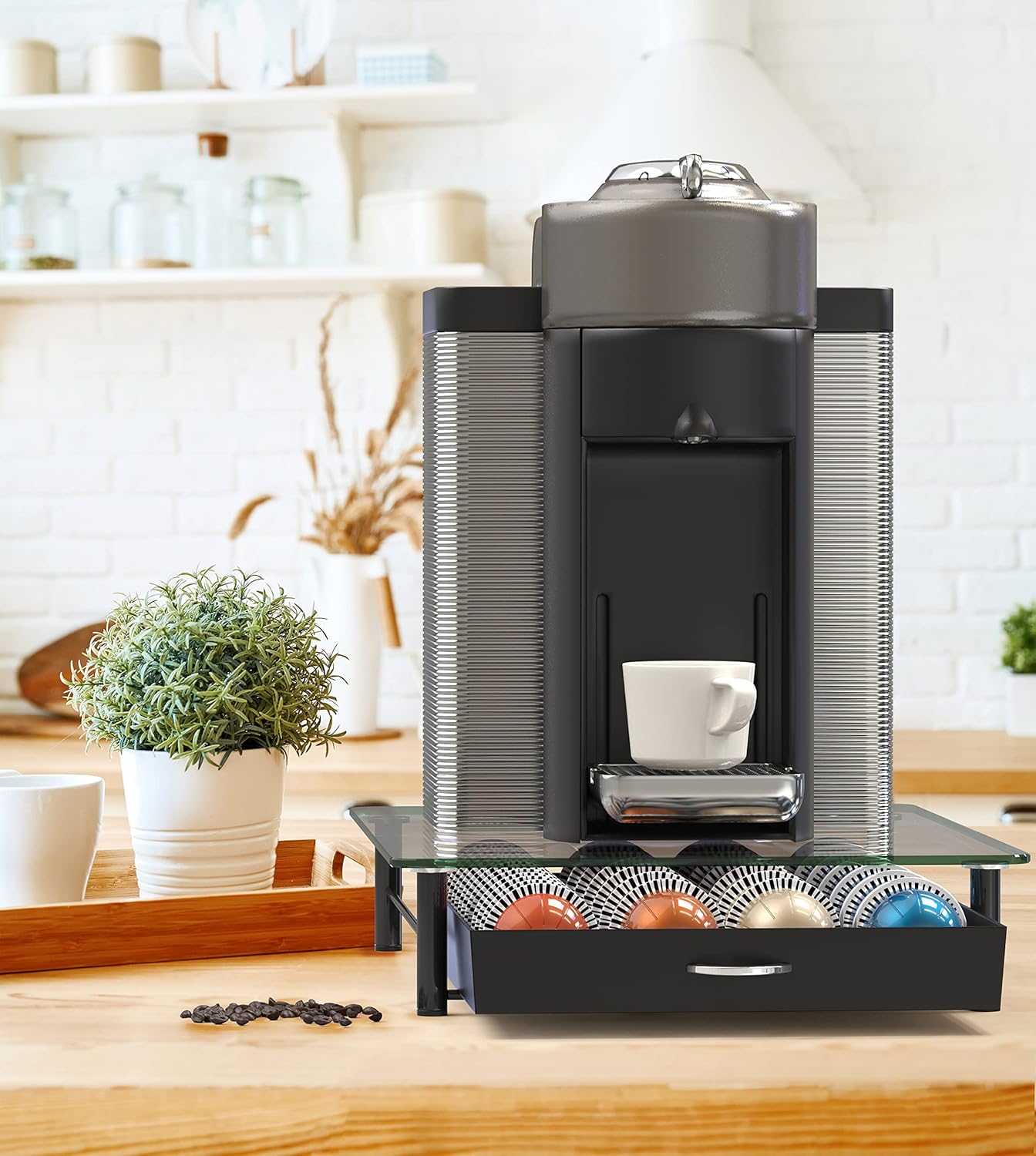 DecoBrothers Crystal Tempered Glass Vertuo Pod Holder Drawer, 28 Large or 56 Small Nespresso Capsule Organizer, Black