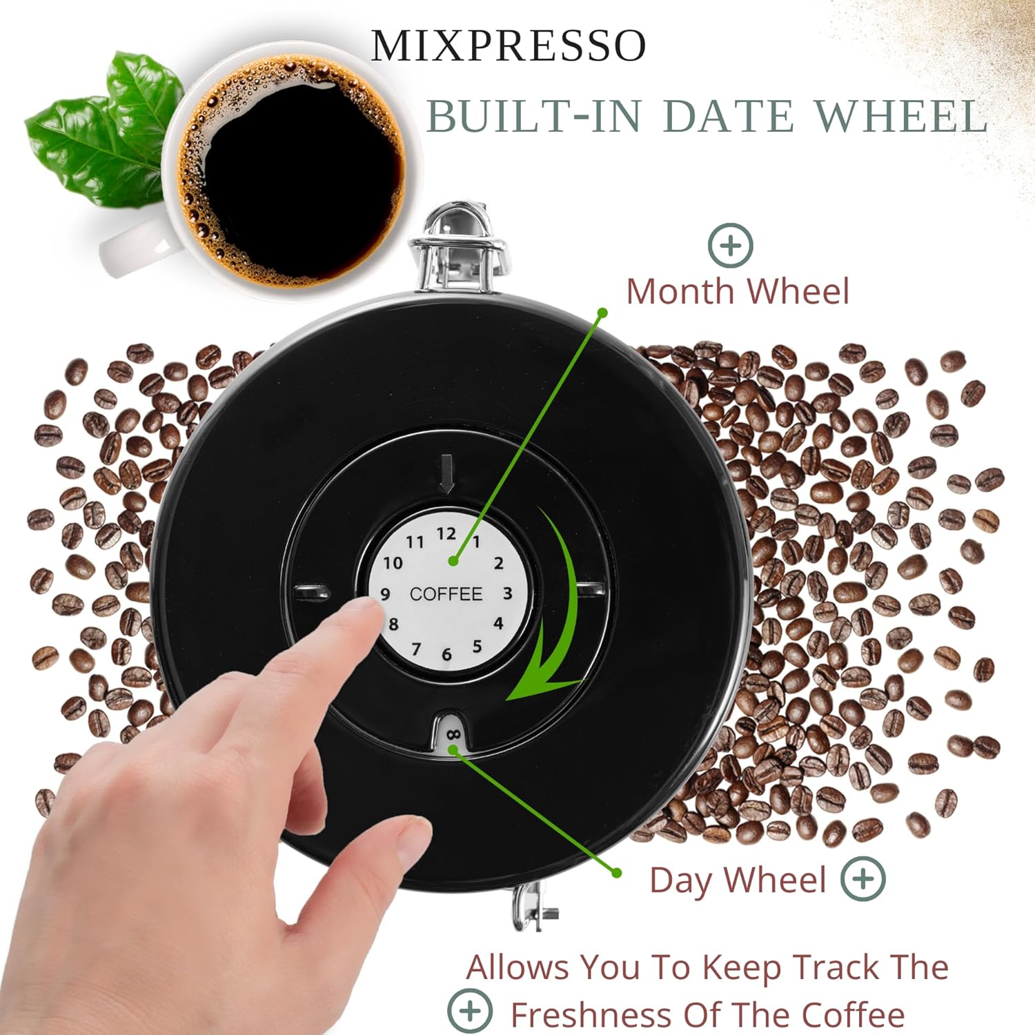- Storage Space with Date Tracker: This airtight container holds up to 16 oz (approx. 450g) of coffee or ground coffee. Built-in lid date wheel helps track freshness, storage time and preserve flavor.