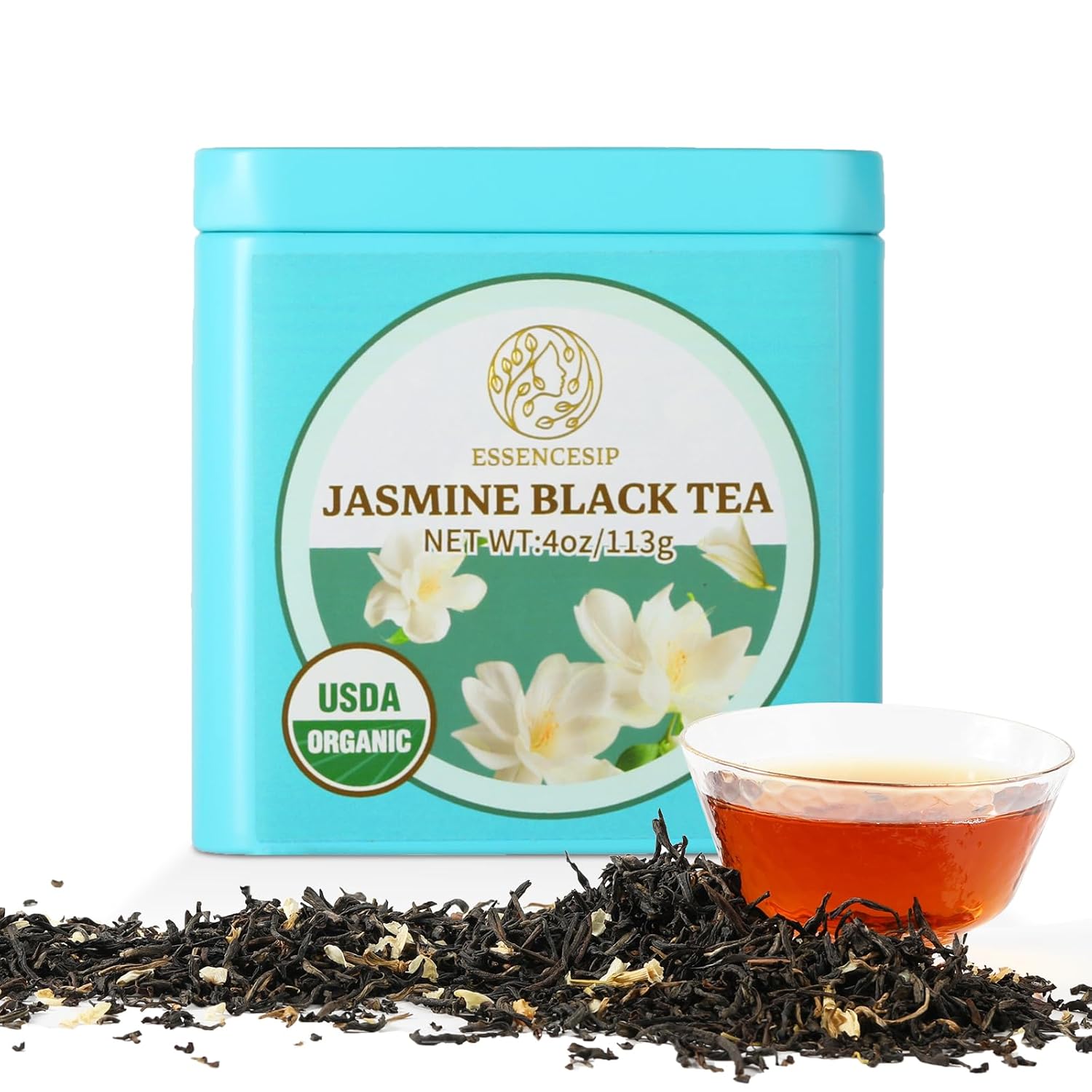 Essencesip Jasmine Black Tea - Floral Twist on Classic English Breakfast Style, 4oz Organic Loose Leaf tea in Reusable Tin