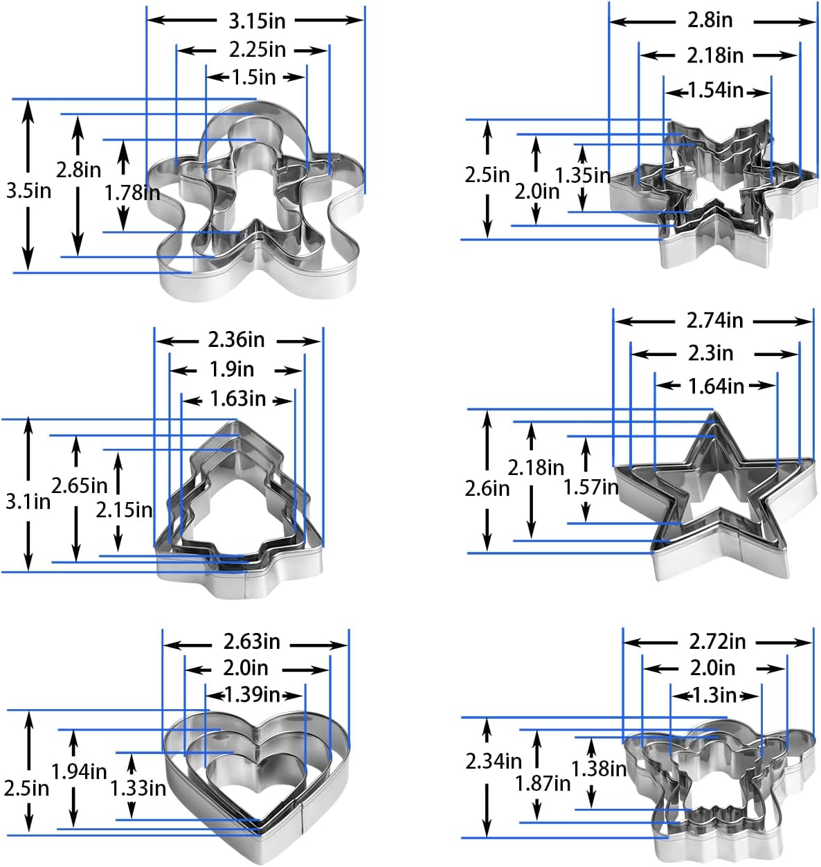 - CHRISTMAS MOLDS SIZES: Cookie cutters height: 0.6inch, Including 3 sizes of 6 different shapes: 3pc Christmas Tree Cookie Cutters: 2.15in, 2.65in, 3.1in; 3pc Snowflake Cookie Cutters: 1.54in, 2.18in, 2.8 in; 3pc Angel Cookie Cutters: 1.3in, 2.0in, 2.72in; 3pc Heart Cookie Cutters: 1.39in, 2.0in, 2.63in; 3pc Star Cookie Cutters: 1.64in, 2.3in, 2.74in; 3pc Gingerbread Cookie Cutters: 1.78in, 2.8in, 3.5in.