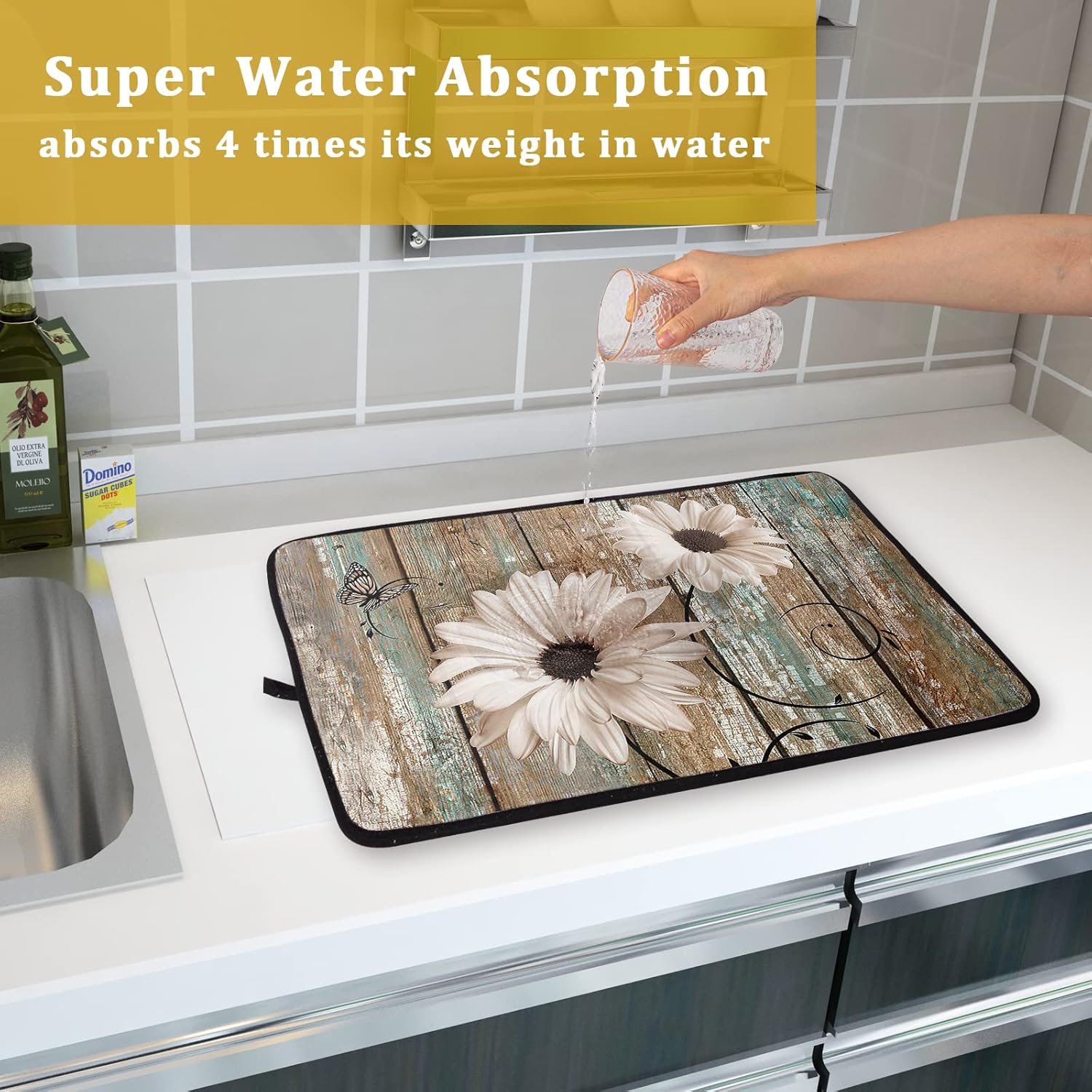 Rustic Daisy Board Dish Drying Mat for Kitchen Countertop 18x24 inch Fall Sunflower on Wooden Plank Dish Drainer Mats Fast Drying Country Shabby Chic Flower Dish Pad Vintage Kitchen Drying Decor Large