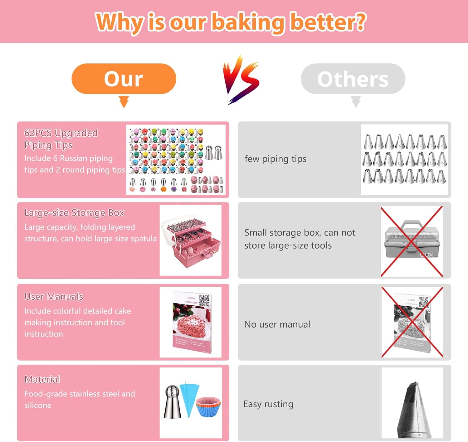 - Package Contents: Layered Storage Box, Spatula, Scraper, 8 Cake Carving Pens, 100 Disposable Piping Bags, Cake Flower Lifter, Triangle Brush, 50 Cake Toppers, Decorating Pens, Egg Separator, 6 Silicone Muffin Cups , 48 Small Piping Tips, 2 Round Piping Tips, 6 Medium Piping Tips, 2 Small Converters, 6 Russian Piping Tips, 3 Hole Russian Converters, 5 Small Measuring Spoons, 2 Small Cake flower nails, 100 muffin cups, 6 cookie cutters, user manual and a book