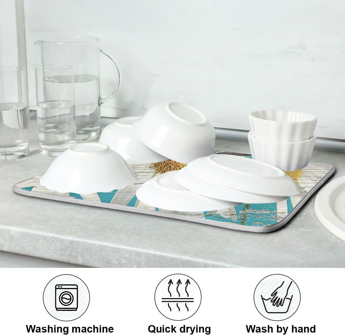Daisy On Old Wooden Board Dish Drying Mat for Kitchen Counter Turquoise Wood Drying Mat 18 x 24 Inch with High Absorbent Reversible Microfiber Dish Drying Pad Drainer Mat for Coffee Bar