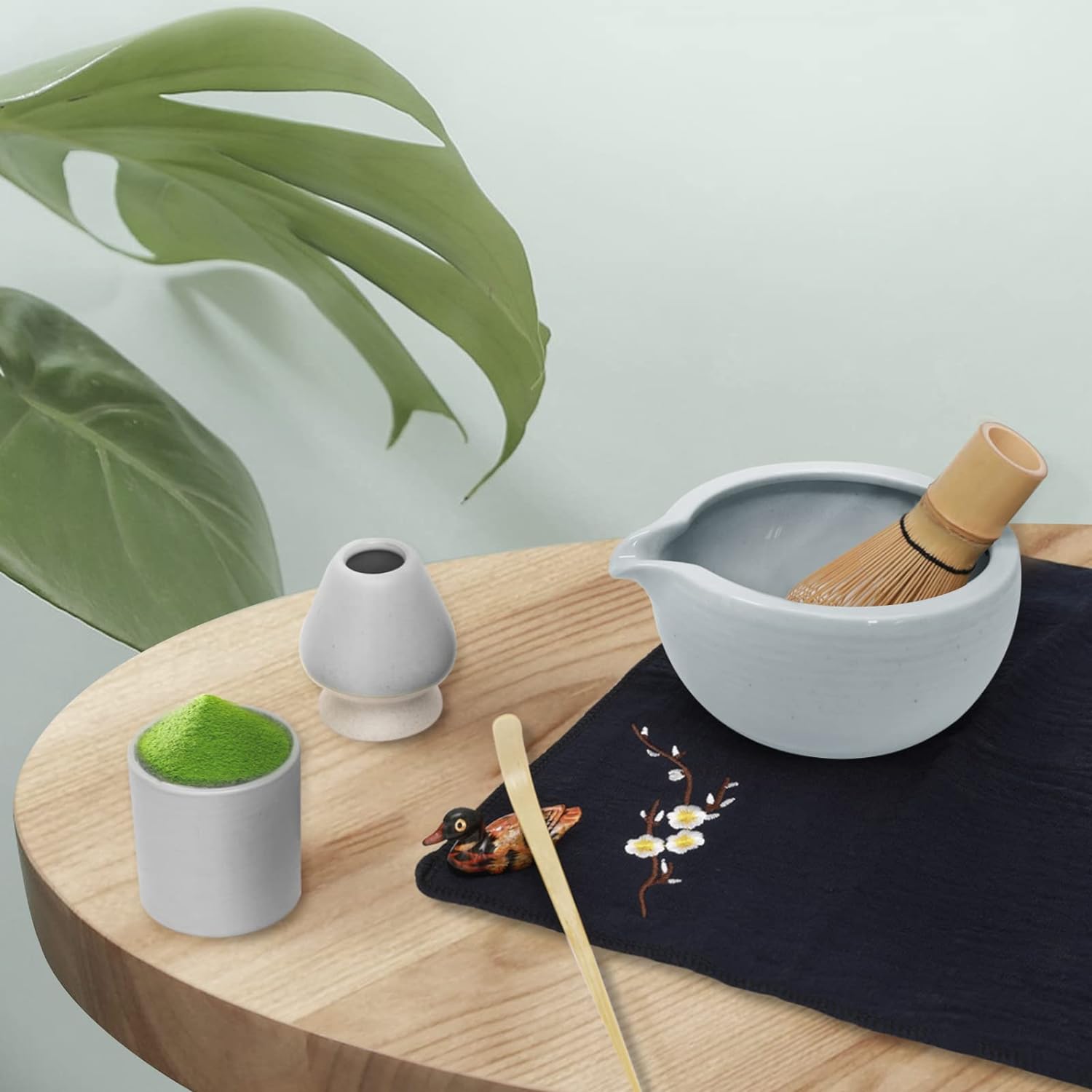 - COMPELETE SET: Matcha whisk, matcha bowl with pouring spout, matcha powder caddy, ceramic whisk holder, tea cloth, tea scoop, tea cloth holder, scoop holder, matcha powder strainer. Our products do not include matcha powder.