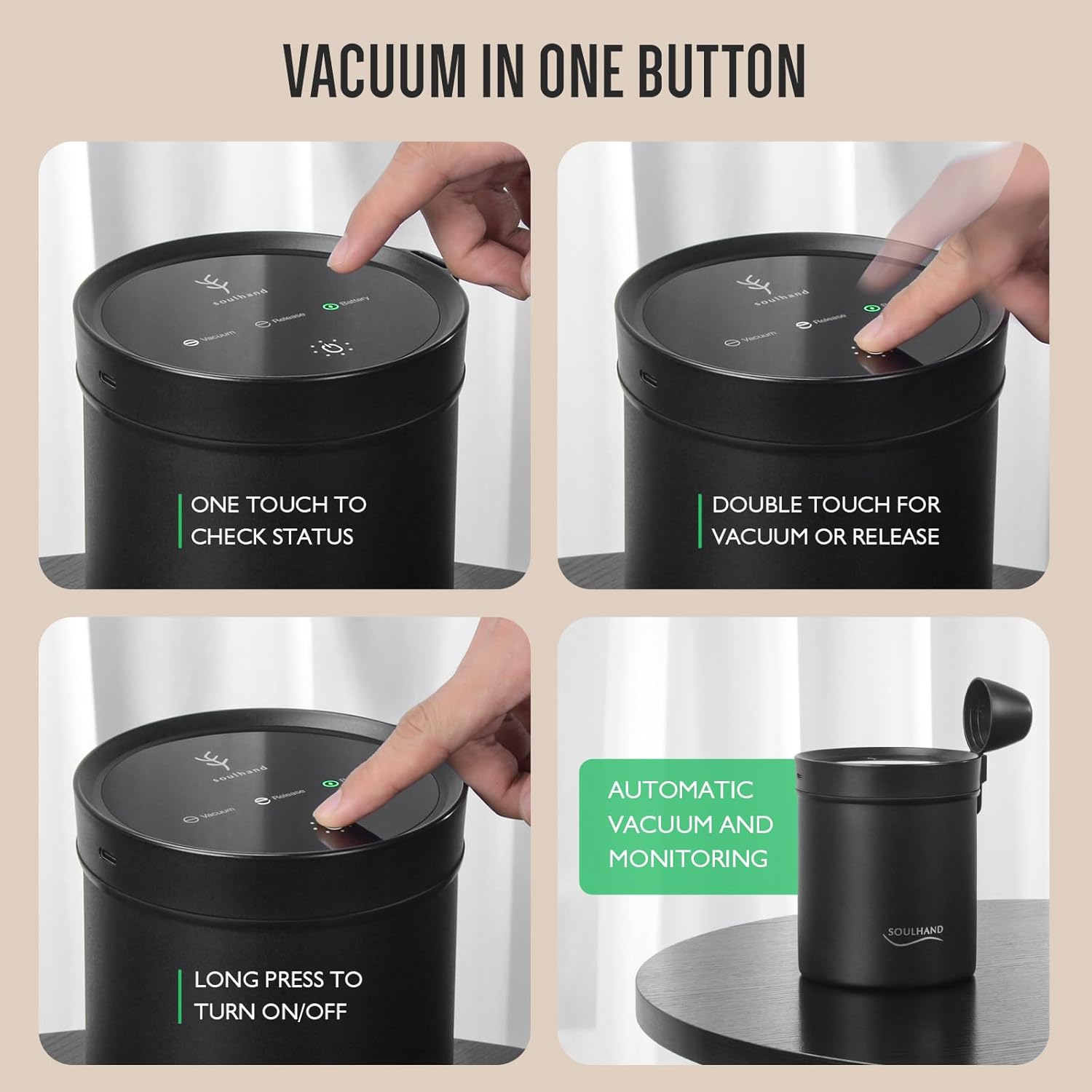 - SMART & SUPER-LONG STANDBY: No manual twisting or pressing is needed to activate the vacuum seal! Our coffee canister can remove air by tapping the top of the lid. It fully charges in 3 hours and can continuously turn on and off 300 times and last for 6 months. Soulhand coffee storage container's unique automatic sealing system will constantly monitor the air pressure inside the container and automatic air exhaust.