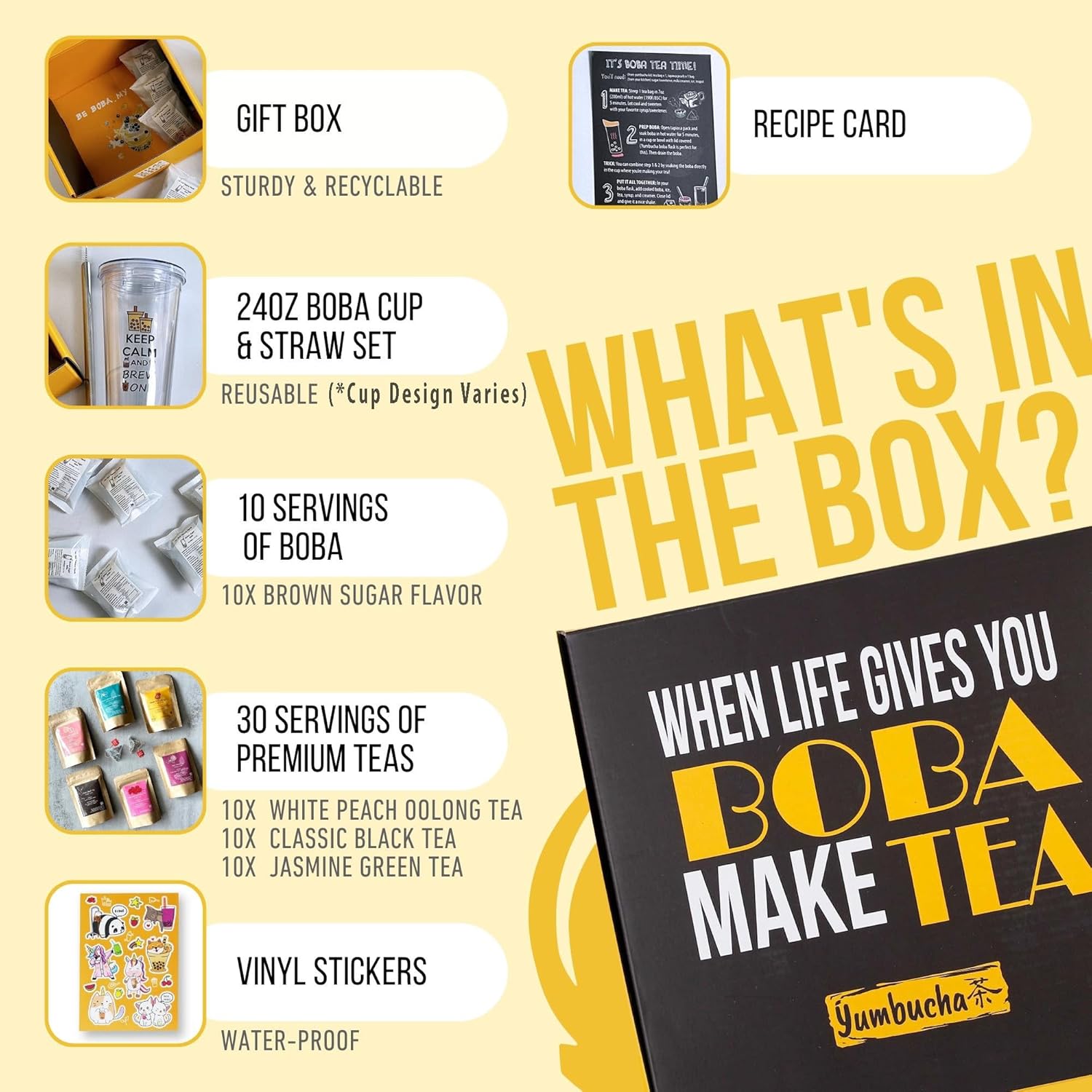 YUMBUCHA Instant Boba Making Kit - A Complete Set for Boba Tea Lovers - 30 Drinks, Reusable Cup & Straw, Tapioca Pearls, and Loose Leaf Teabags - White Peach Oolong, Jasmine Green, Classic Black