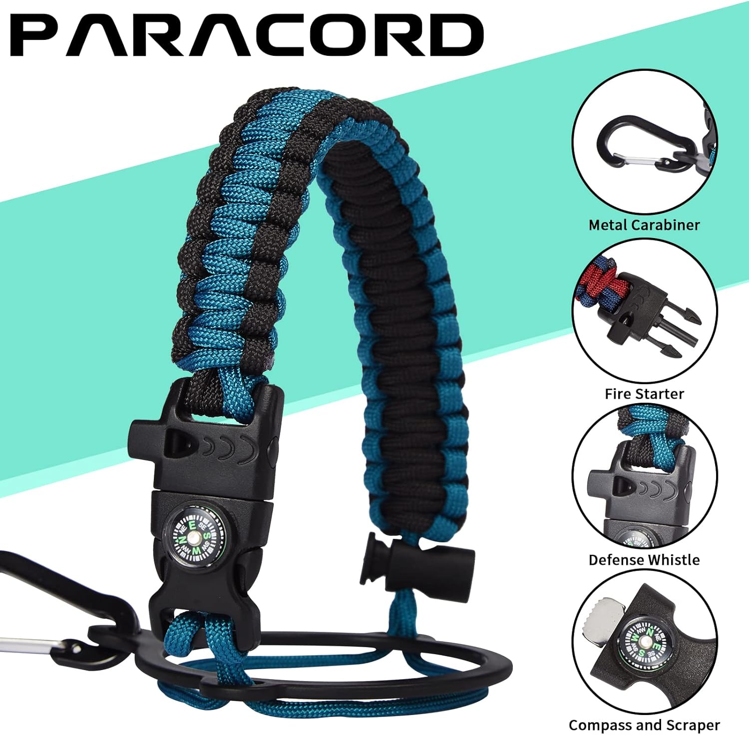 - UNIQUE DESIGNS PARACORD HANDLE: Full-function paracord handle made in individual styles to match the color of the flask water bottles. With compass, safety ring, carabiner, flint fire starter & whistle. It unravels into a sturdy and taut rope in an emergency, making the large water jug an ideal survival kit for expeditions in the wild