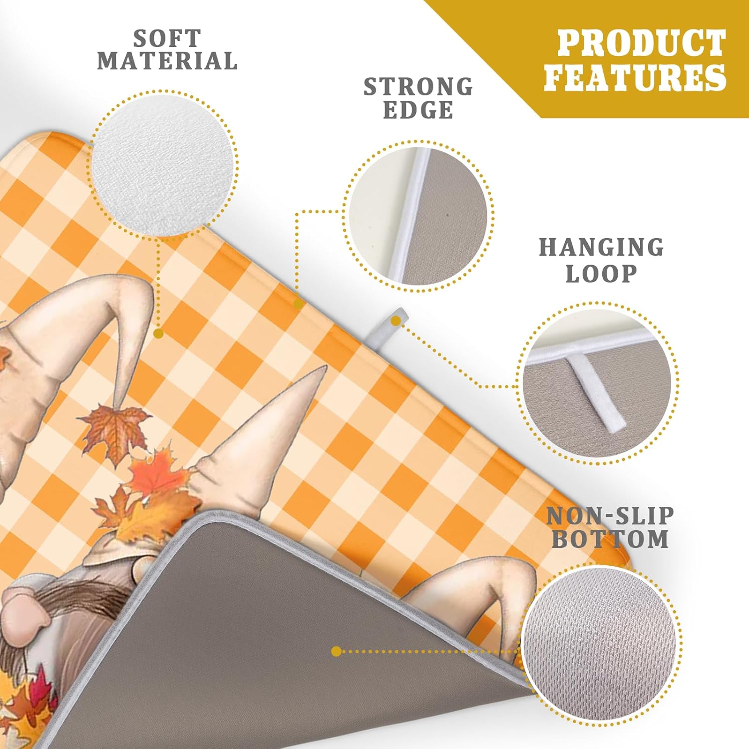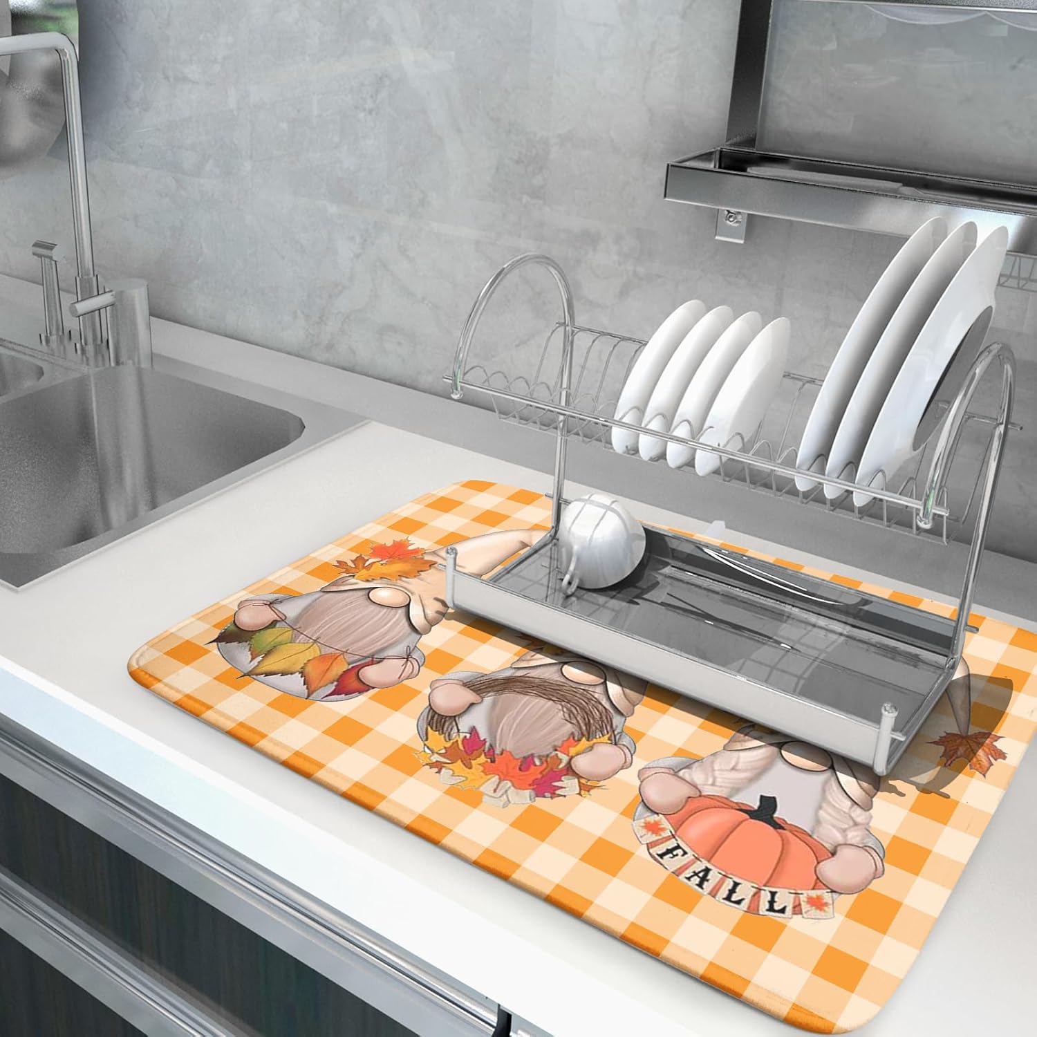 Fall Gnome Dish Drying Mat for Kitchen Autumn Pumpkin Maple Leaves Dishes Pad Orange White Check Plaids Dish Drainer Rack Mats Absorbent Fast Dry Counter Accessories 18x24inch Thanksgiving Day Decor