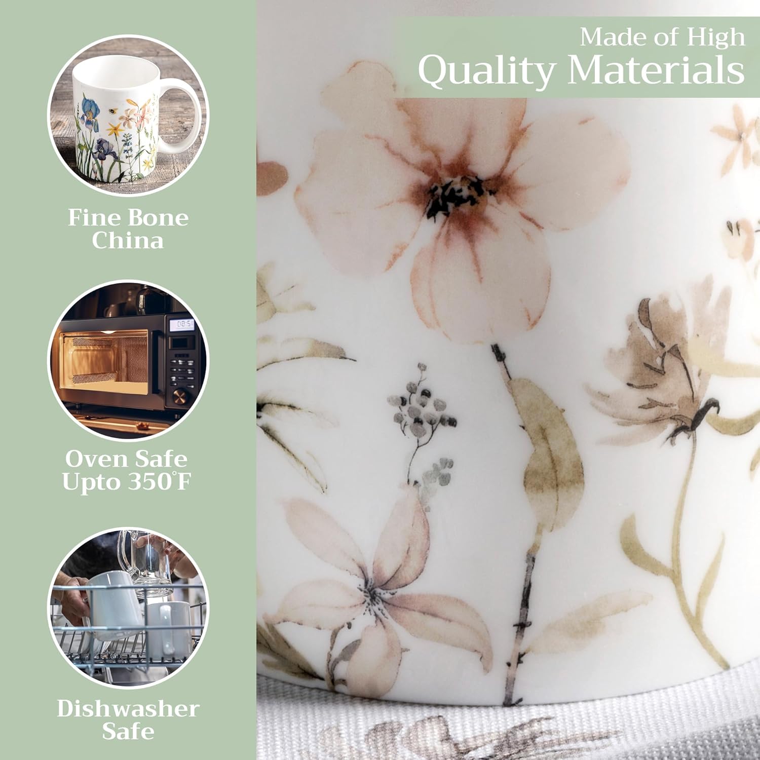 - Easy Care & Maintenance: Microwave, dishwasher, and oven safe up to 350°F. These bone china mugs are built for convenience and durability, making cleanup and reheating simple without compromising on quality