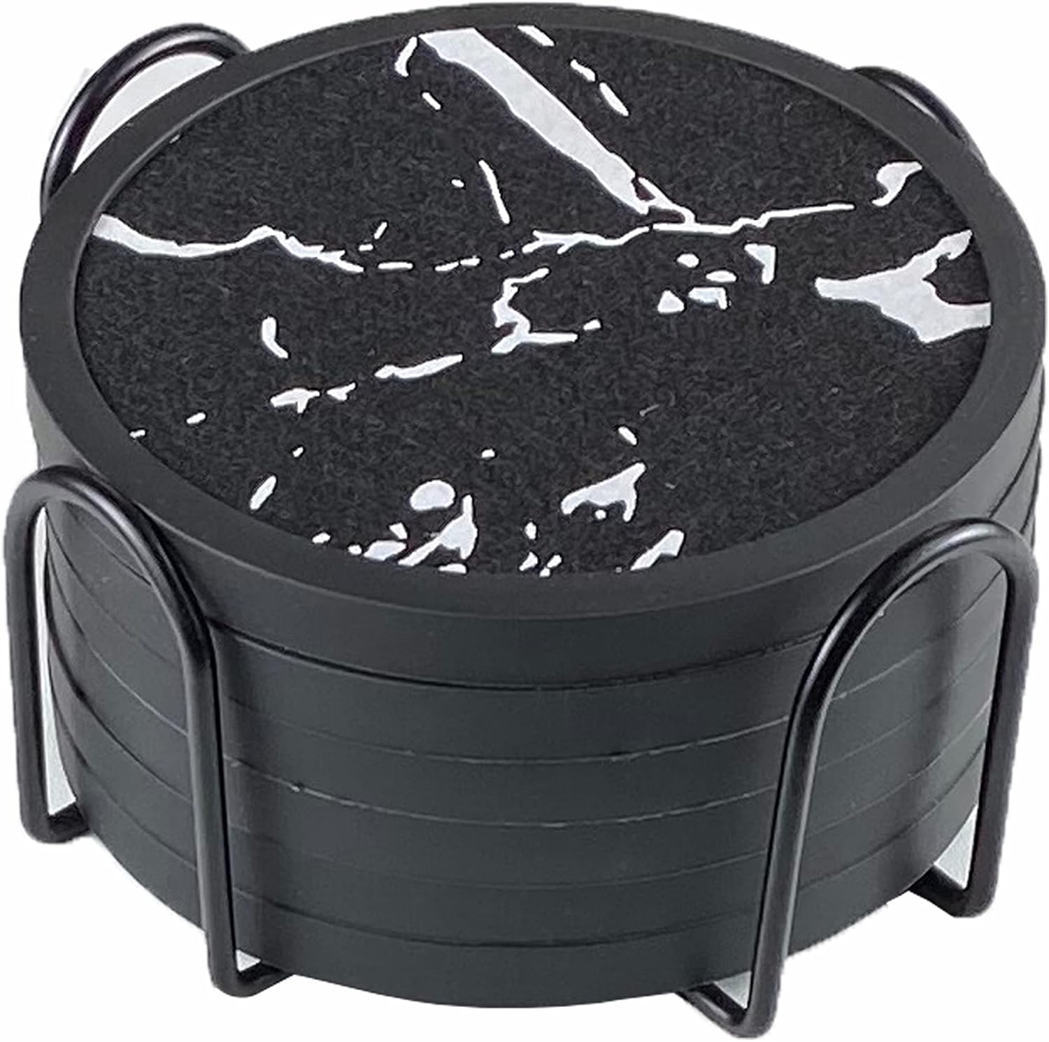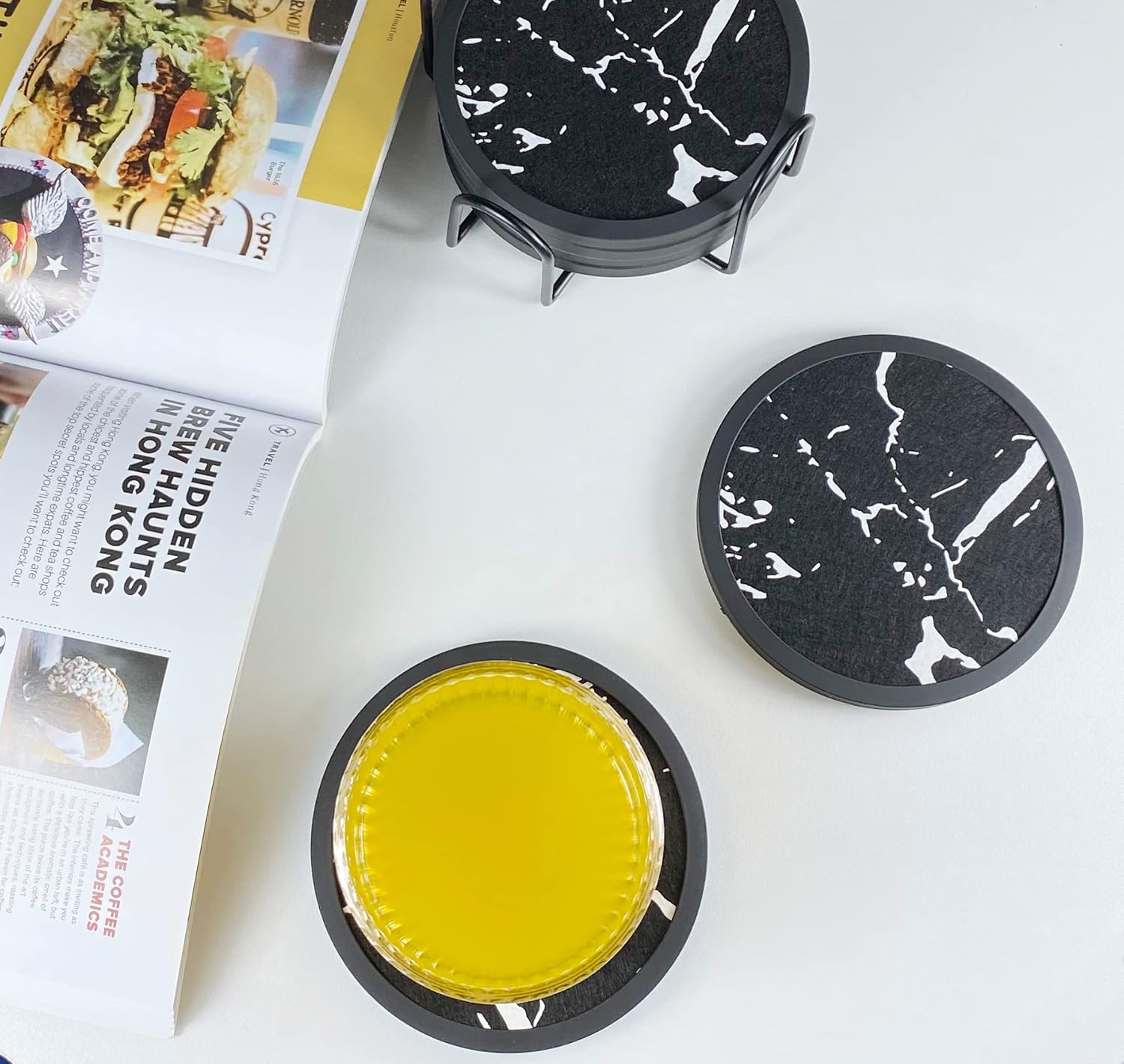 - What You Get: 6 non-slip silicone drink coasters(round, black, 4.3 inch), 6 absorbent felt inserts(round) and a 4.5-inch metal holder(black). The silicone coasters can be used alone, or with the inserts. Fits all types of bottles/cups/mugs/tumblers