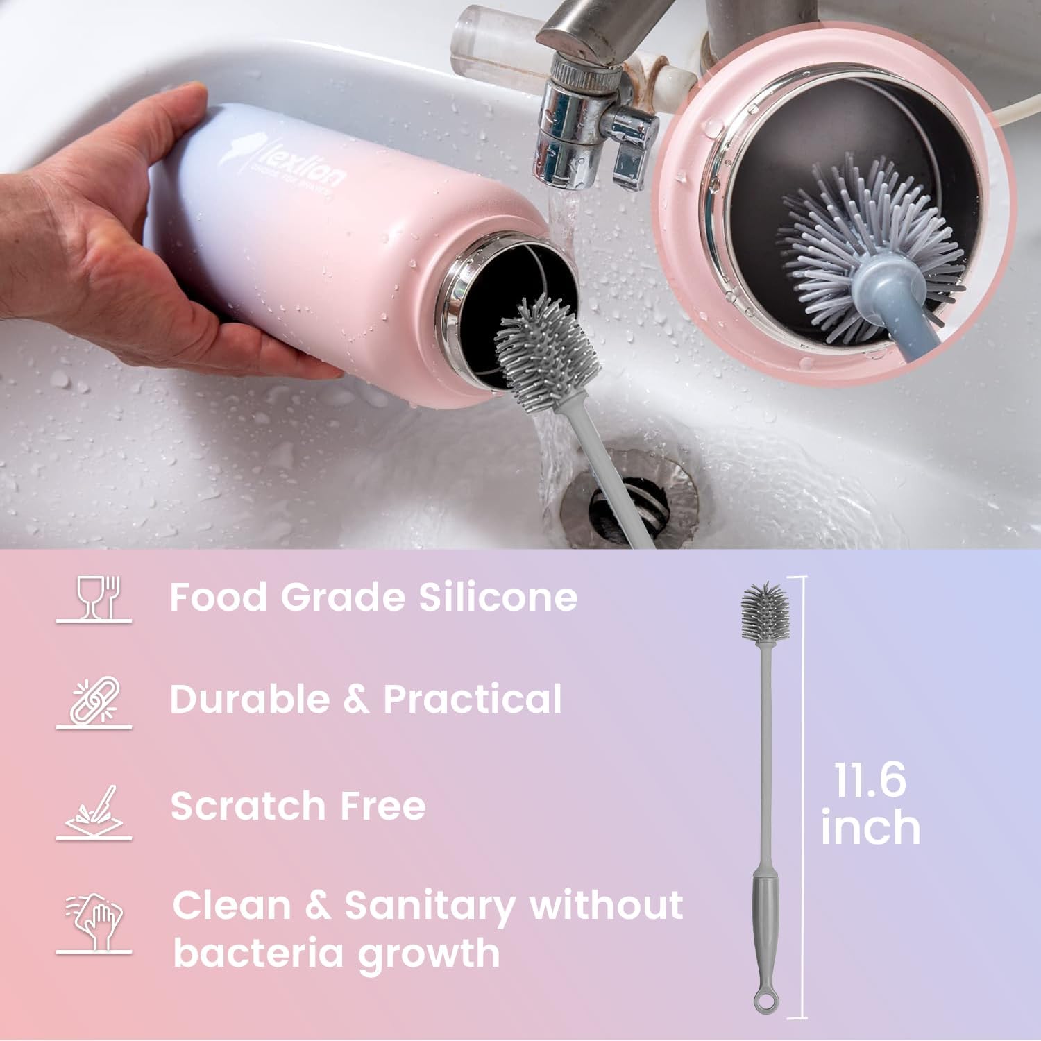 - ✅ SILICON CLEANER BRUSH - Our silicone bottle cleaner brush repels unpleasant odors, and stains, - unlike sponge and nylon brushes - preventing nasty stain build-up so more healthier for your family. It cleans all nooks, and crannies and reaches all the areas of your insulated water bottle 32 oz, and tea/fruit infusers. You will no longer worry about the smelly sponge bristles. The bristles of the thermos water bottle 32 oz brush always keep their shape and it is scratch-free.