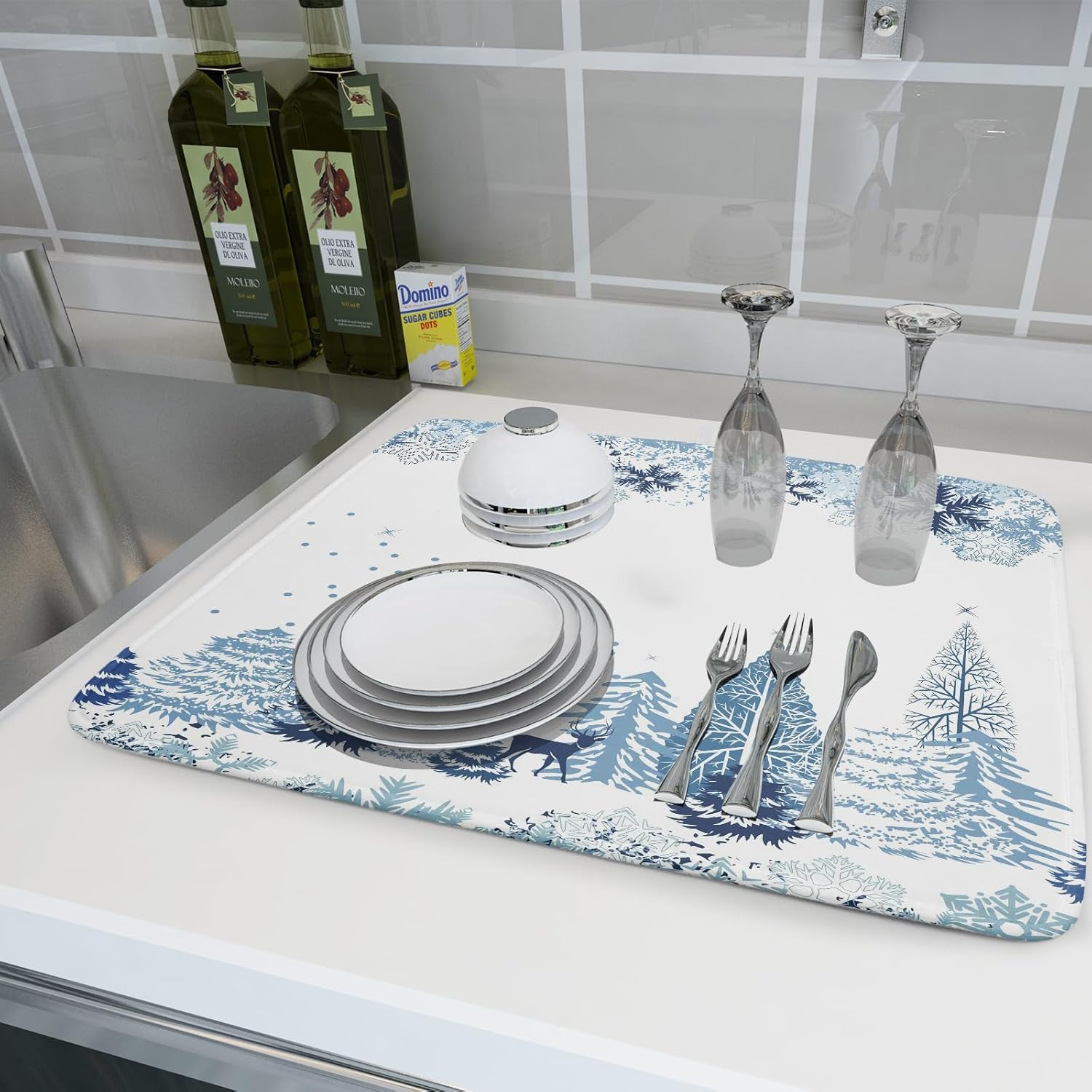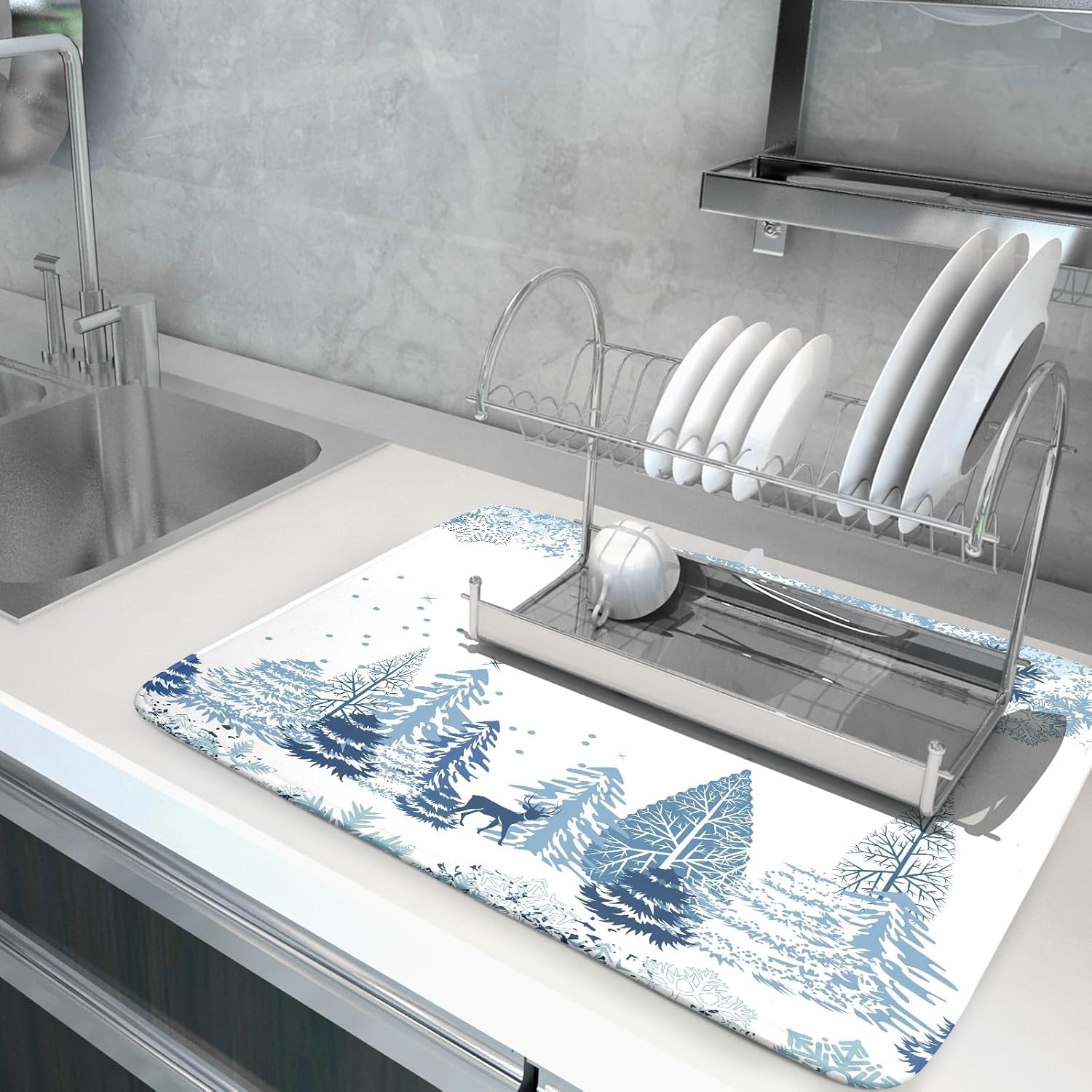 - ❀ 【HIGHLY ABSORBENT, QUICK DRYING】 With the middle made of composite sponge, microfiber terry cloth on the reversible side absorbs 4X its weight in water, which easily keeps your counter dry. Use alone or pair with a dish drainer. Our ultra Winter Forest absorbent Dishes Pad will suck up all the left wetness from your pots, pans, and dishes, and leave the underside both dry. Our slip-resistant backing adds stability when drying stemware or other delicate items.