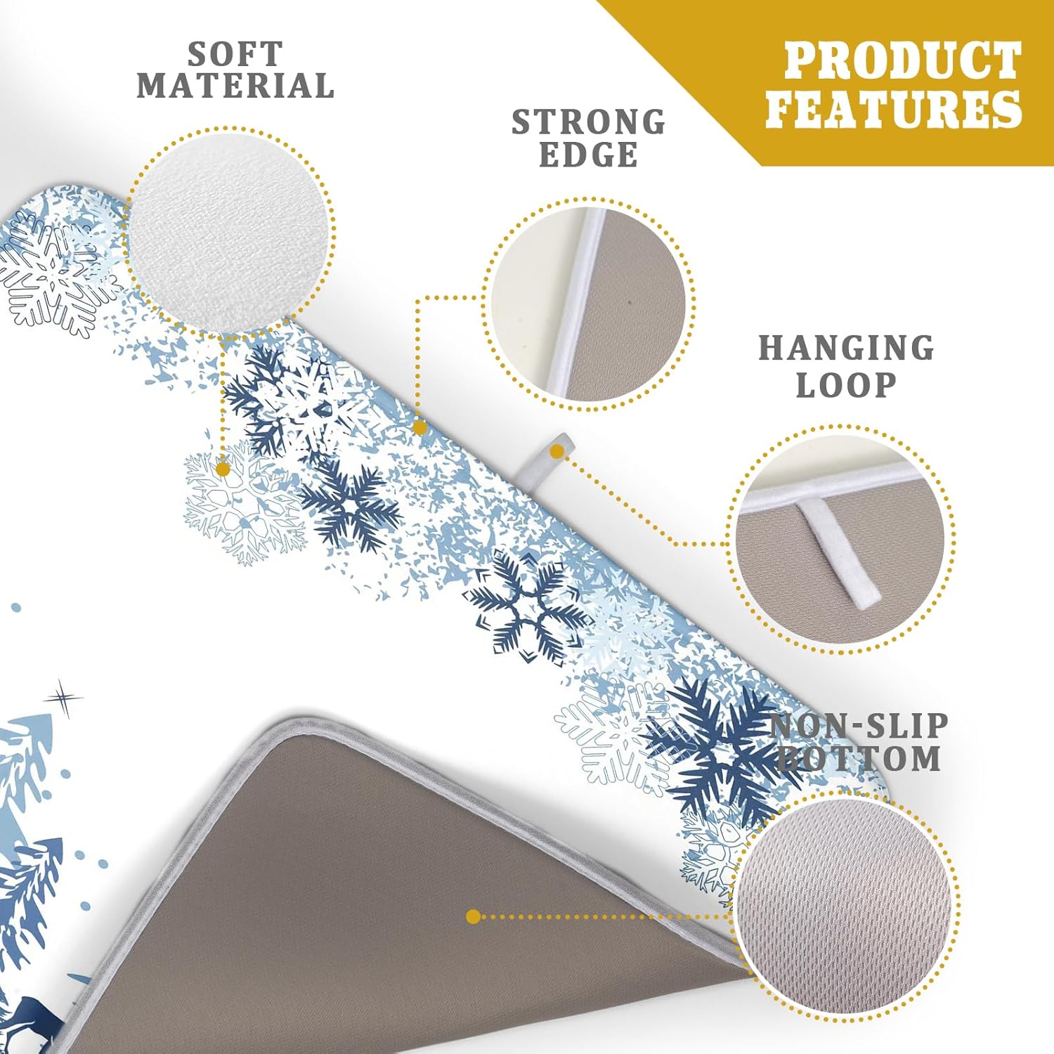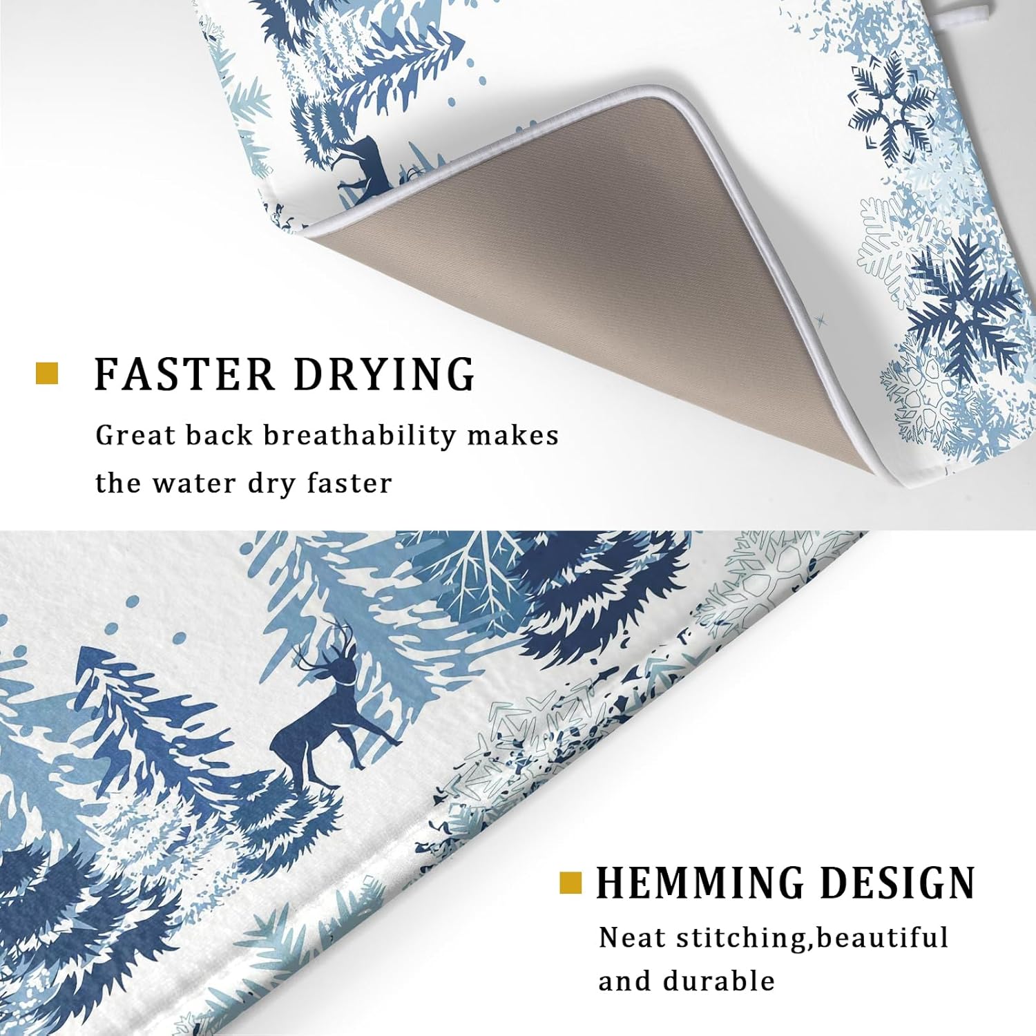 Winter Blue Snowflake Dish Drying Mat Christmas Tree Kitchen Counter Dish Drainer Mats Xmas Forest Deer Moose Dish Dry Pad Bottles Protector for Kitchen Countertop Coffee Bar, 18x24 inch Large