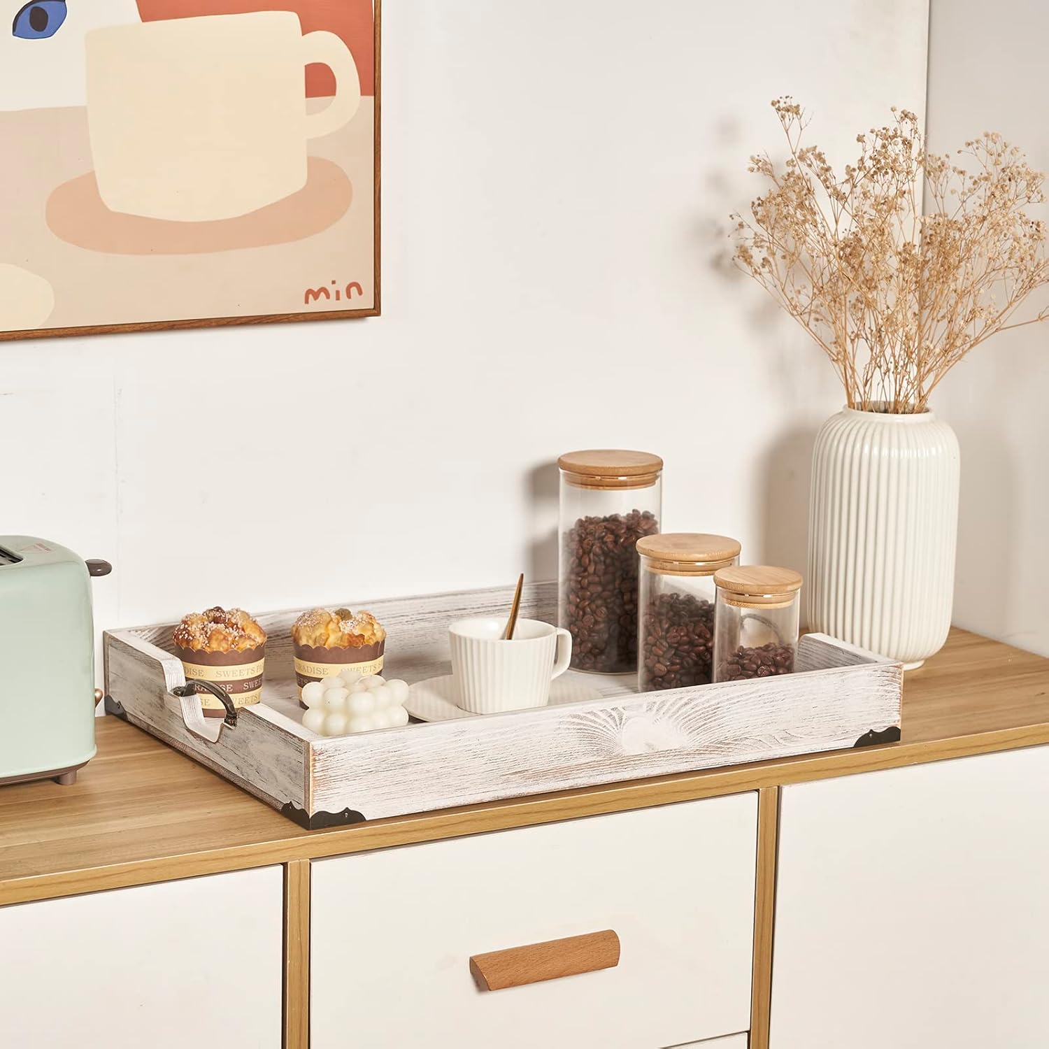 - High quality pine wood: Unlike others, our trays are crafted with only solid pine wood, Never fir or paulownia. Our kitchen serving tray is stronger, durable and long lasting. Our rectangle vintage rustic serving tray with shabby whitewashed, it is a very retro and beautiful decoration. Please allow the color maybe variance due to handmade painting