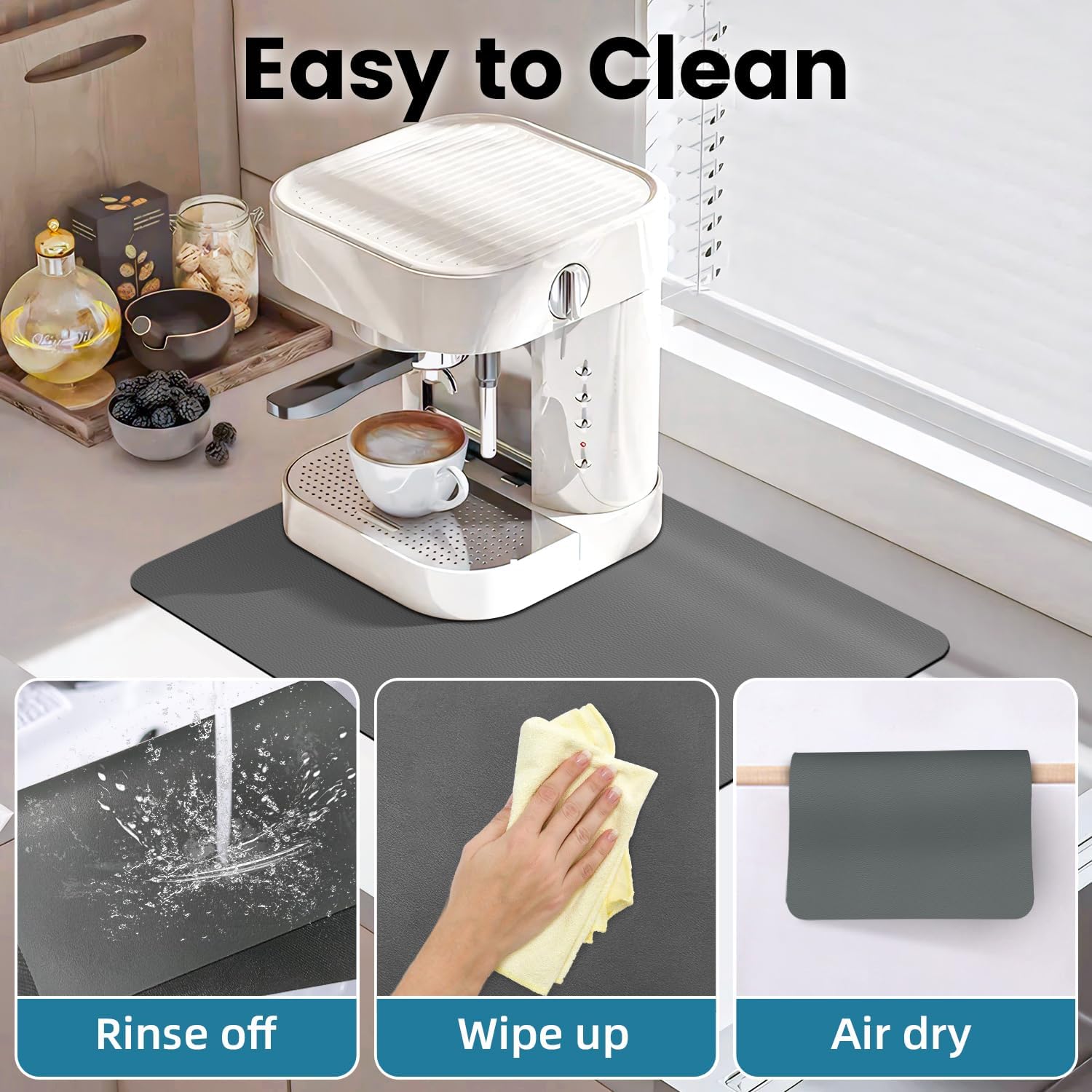 - Anti-Slip Rubber Backed: The bottom of this coffee machine mat is made of non-slip rubber, it will not move on the countertop. The rubber backing can protect your countertop from being damaged, it's the functional coffee accessories for coffee bar