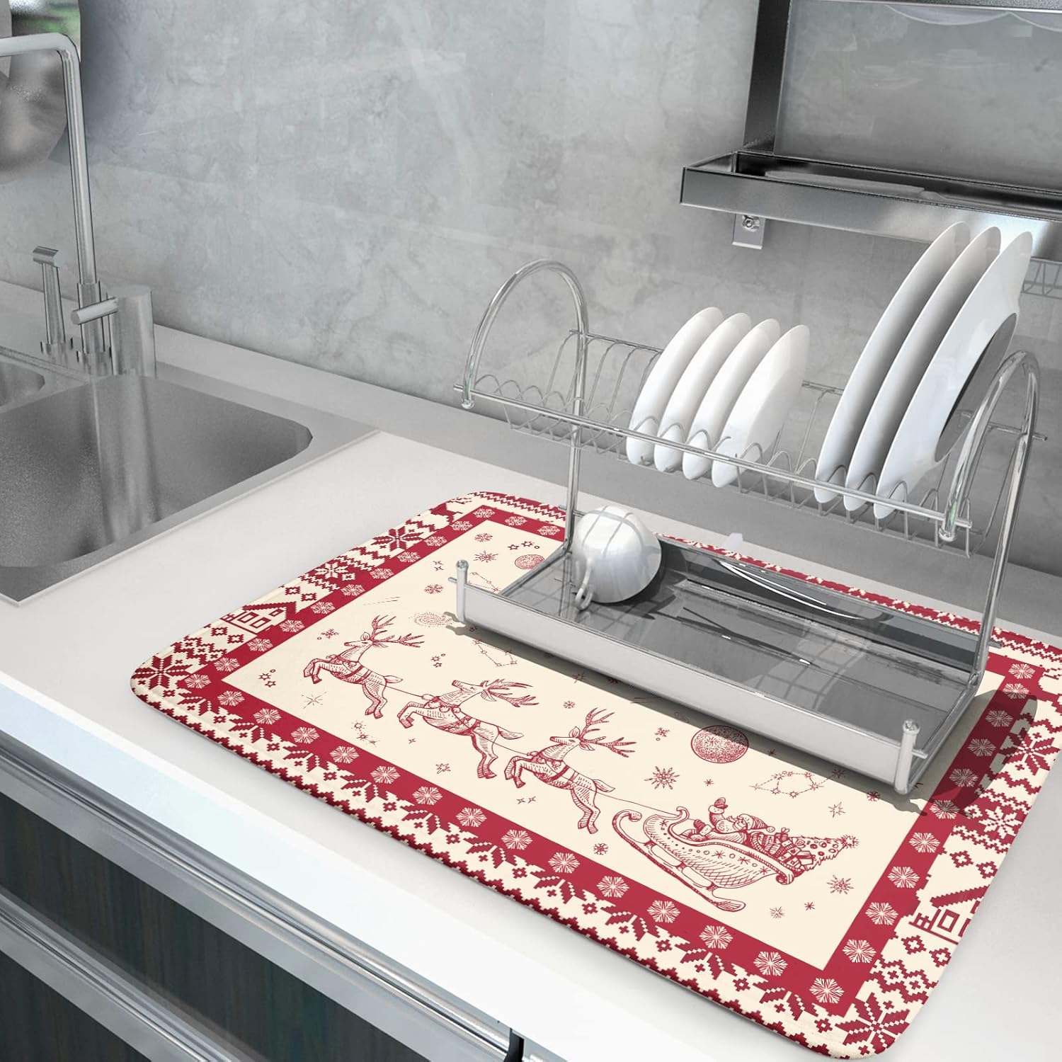 - Easy Storage: The dish drying mat with hanging loop, can be hung on the kitchen wall. This lightweight Christmas Reindeer kitchen dish drying mat, Soft and foldable, Microfiber is naturally, durable, and cleans up easily, and is effortless to clean. frees up space for your kitchen when in use, simply fold up and toss in a drawer or tuck it elsewhere when not in use.