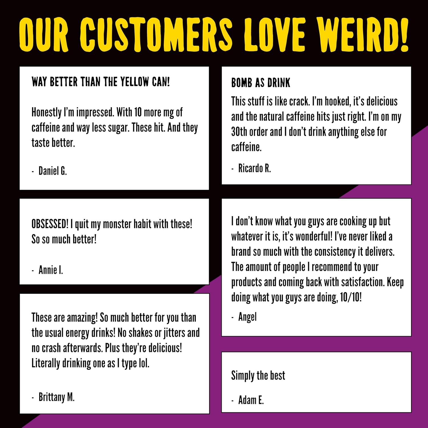 - 🌎 Sustainable & Eco-Friendly Packaging DRINK WEIRD comes in eco-friendly recyclable aluminum cans, because caring about the planet is part of the Weird way. Give a poop. Don’t pollute.