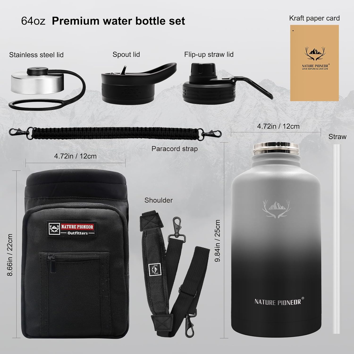 NATURE PIONEOR Insulated Water Bottles with Straw - 64oz Stainless Steel Vacuum Bottle with Holder/Carrier/Sleeve - Reusable 18/8 Food Grade Half Gallon Water Jug