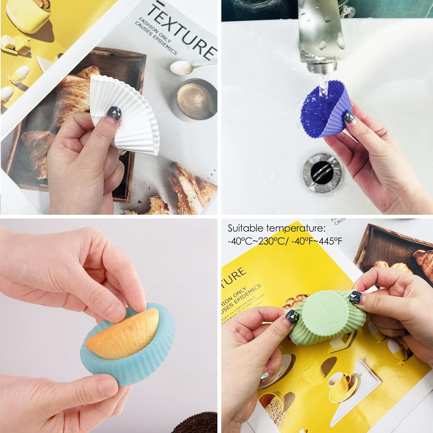 - HIGH QUALITY: Each baking cup is made of 100% food-grade silicone and meets FDA standards. Microwave, Refrigerator, Oven, Dishwasher safe. Please use at the following temperatures: -40°C~230°C/ -40°F~445°F.